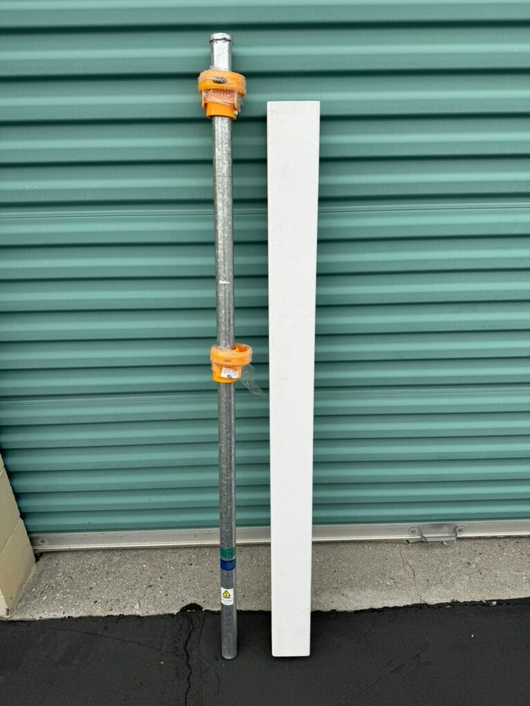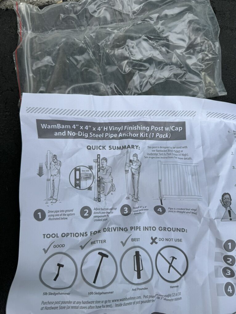 New WamBam vinyl fence post kit. Has a 4ft tall, 4x4 inch white vinyl finishing post and a no-dig steel pipe anchor. Will need a new cap