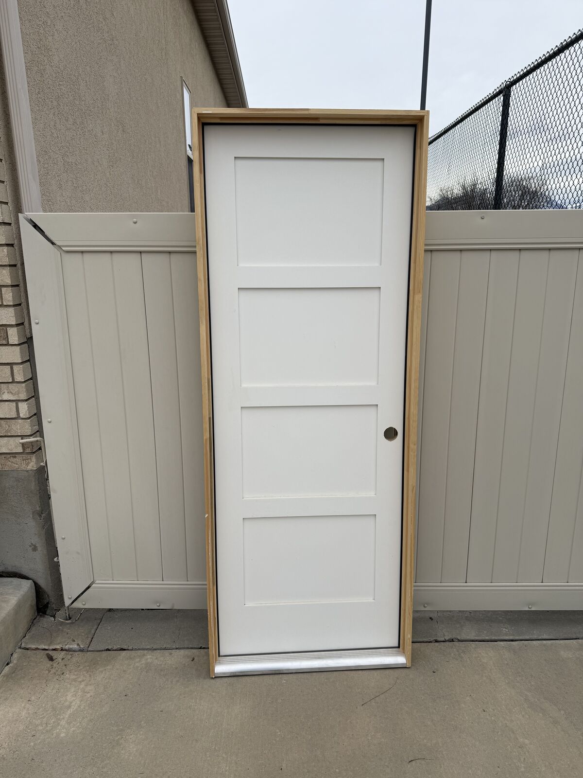 Photo #6 2'6"x6'8" door with standard jamb. 4 panel, left-handed, solid core, threshold, black hinges, unpainted, never installed.