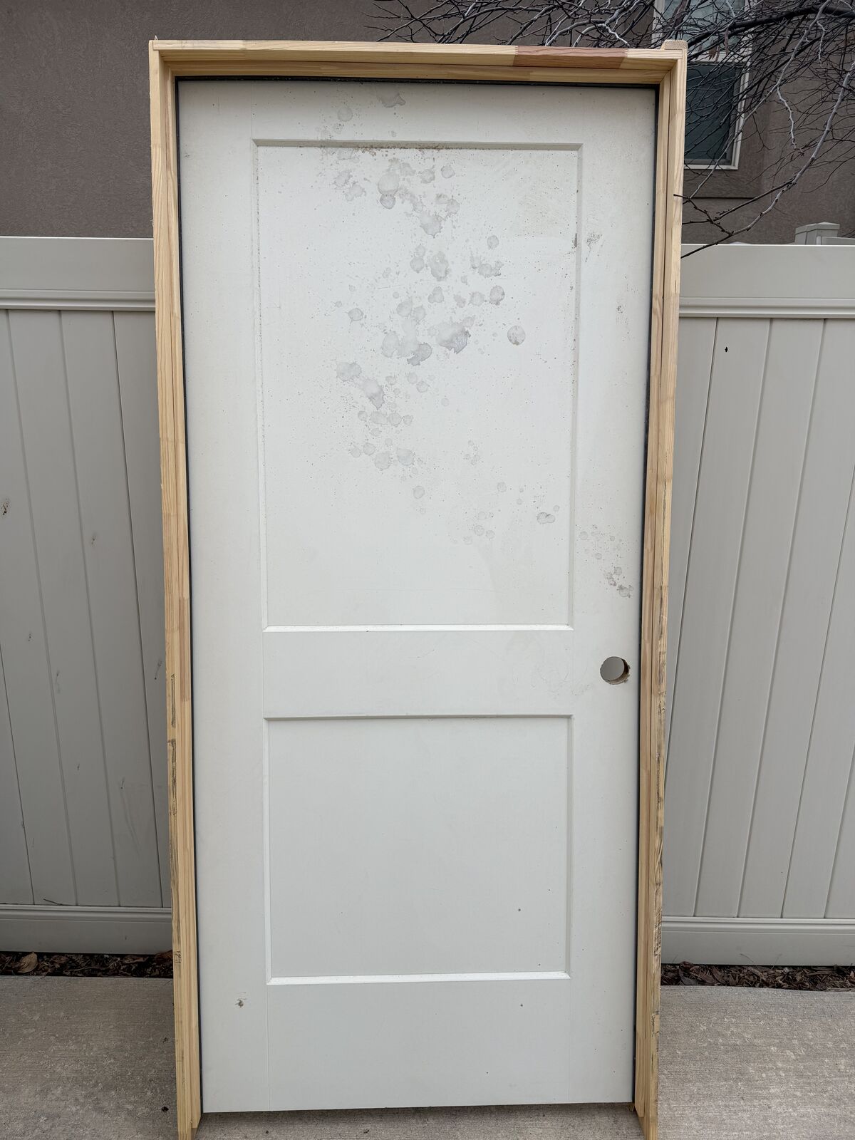 Photo #7 3x6'8" door with standard jamb. 2 panel, left-handed, hollow core, weather stripping, black hinges, unpainted, never installed.