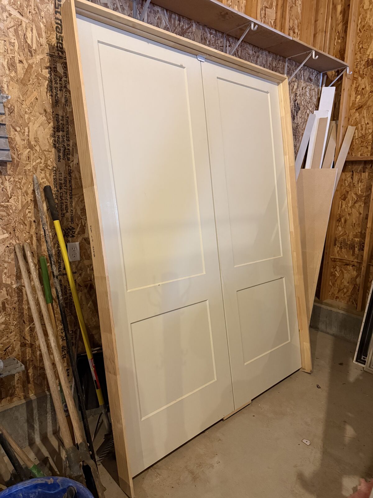 Photo #4 6'x8' double doors with jamb. 2 panel, left-handed, solid core, satin brass hinges, unpainted, never installed.