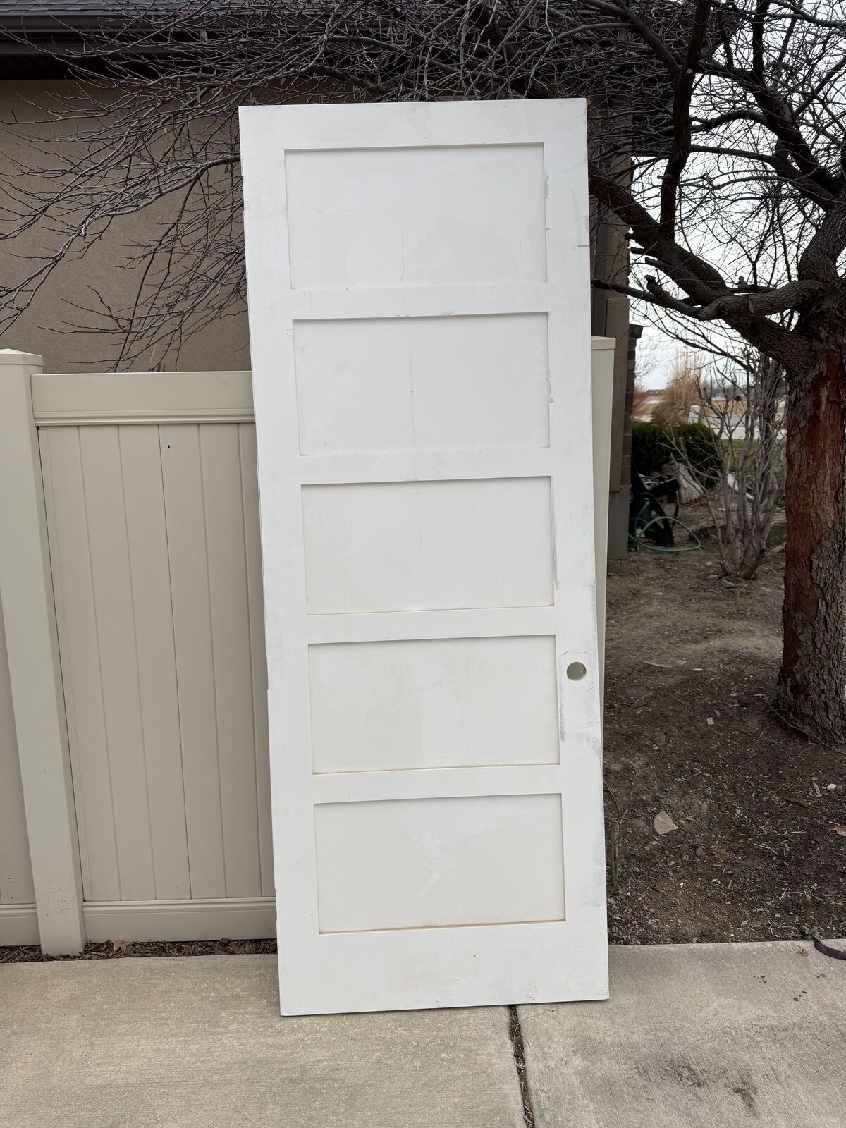 Photo #2 3'x8' door slab. 5 panel, right-handed, solid core, painted white, previously installed.