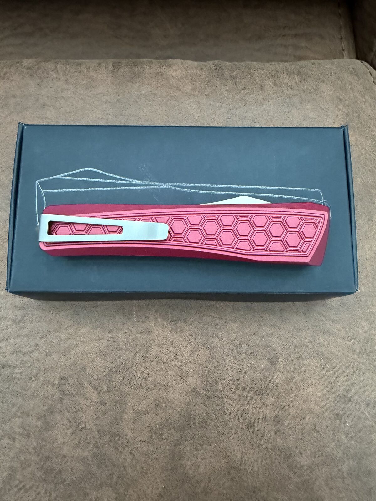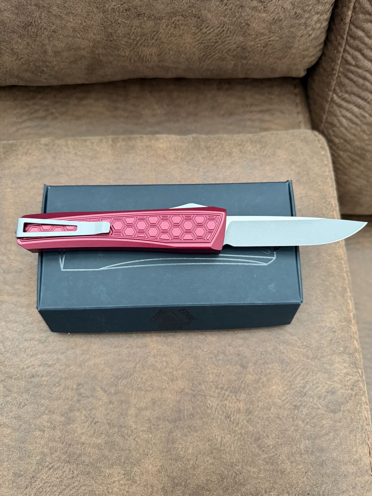 VenmoI am selling my core edge 0331 otf. This is the echo version of the 0331 and has a honeycomb pattern. The blade is Magnacut and the handle is aluminum. One thing that makes these a bit different from other otf's is the centered blade. The action is incredibly snappy on this guy as well. This has never been used or sharpened. Just played with a few times, and then placed back in my knife case. $300