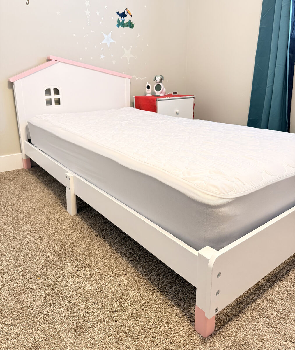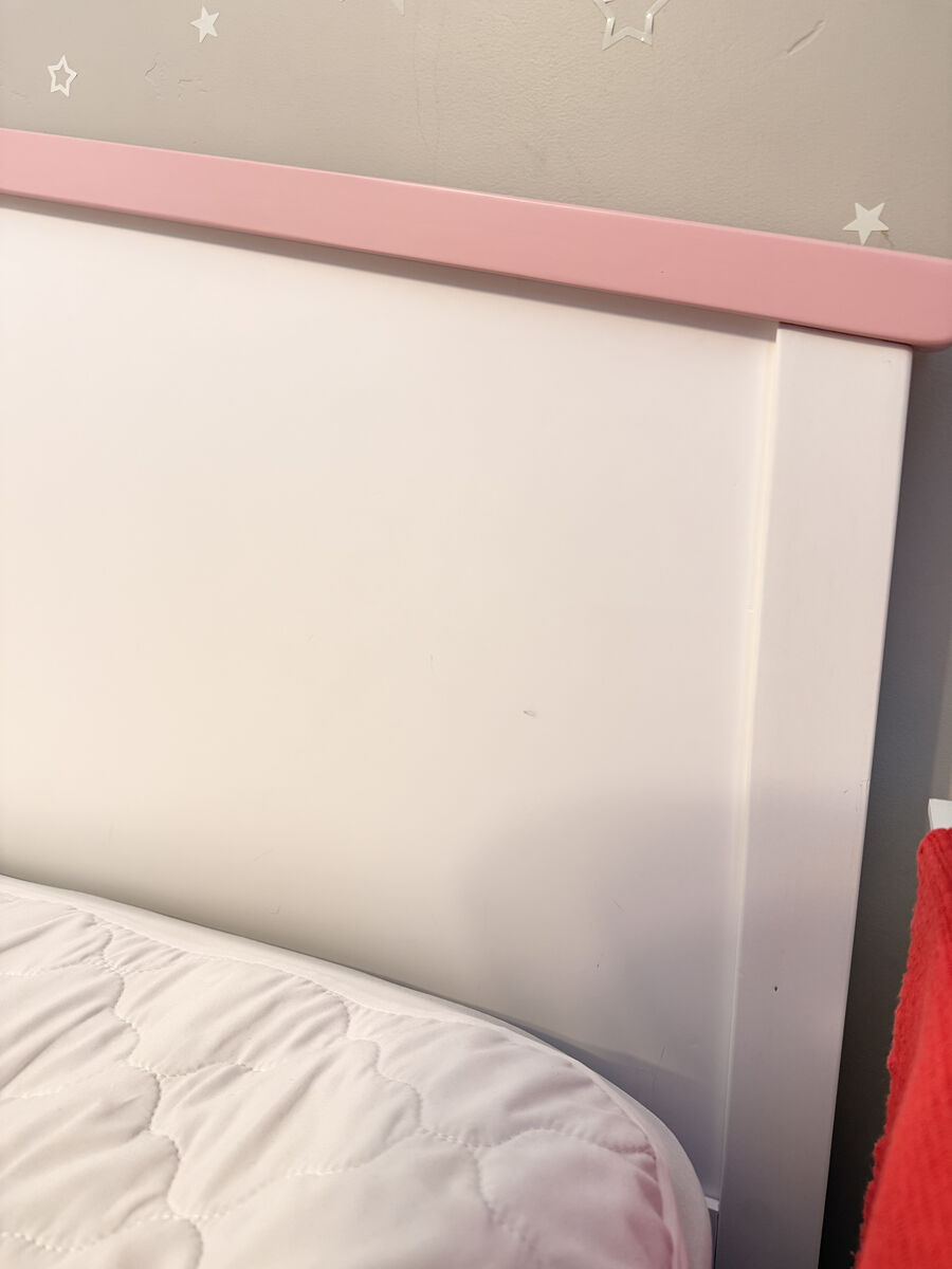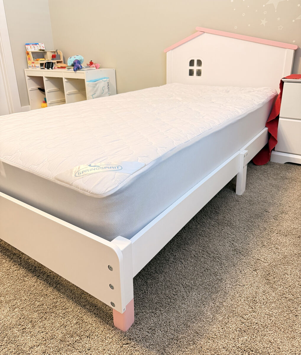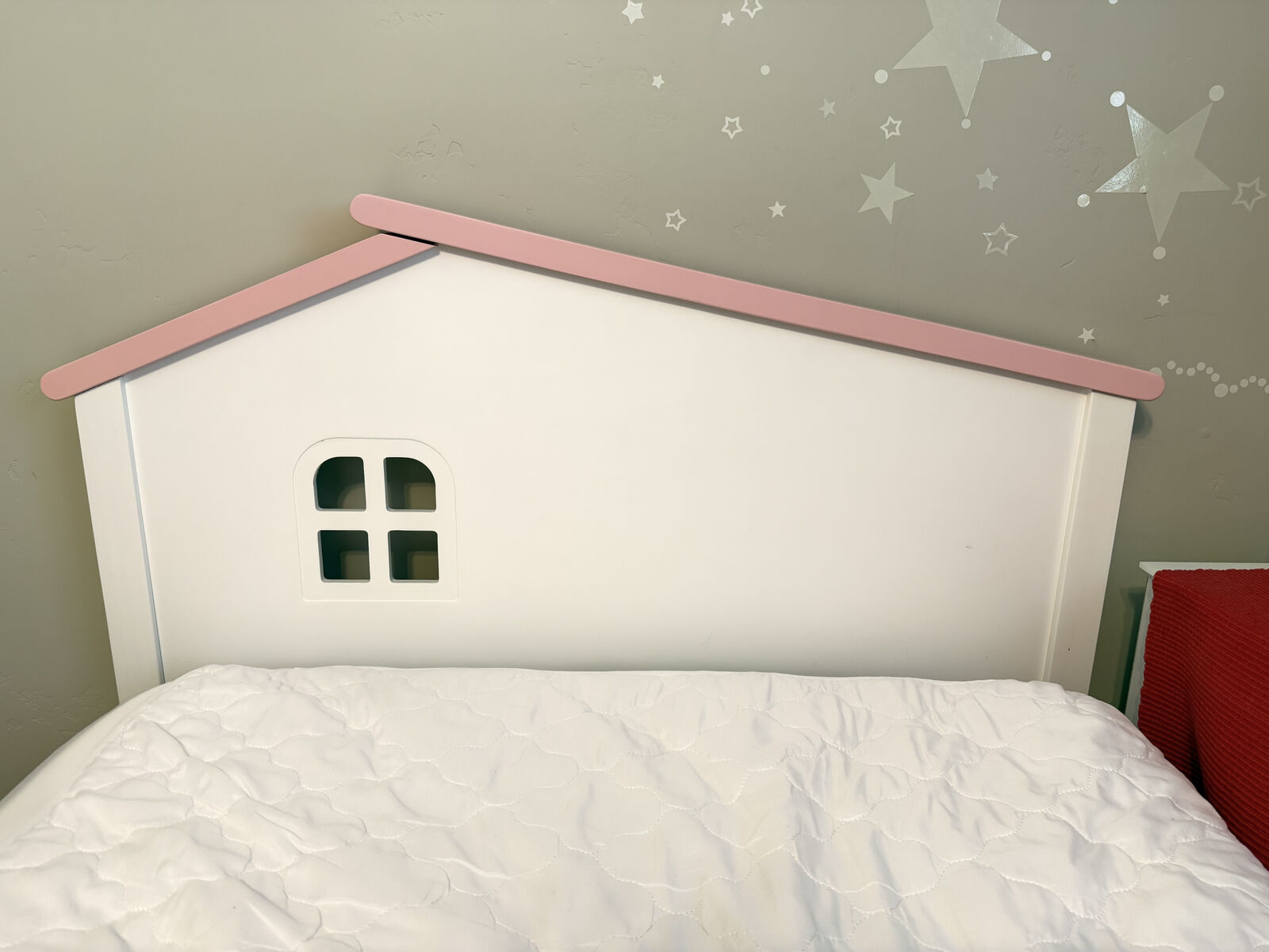 Sturdy white wooden frame with a cute house style headboard and soft pink accents.