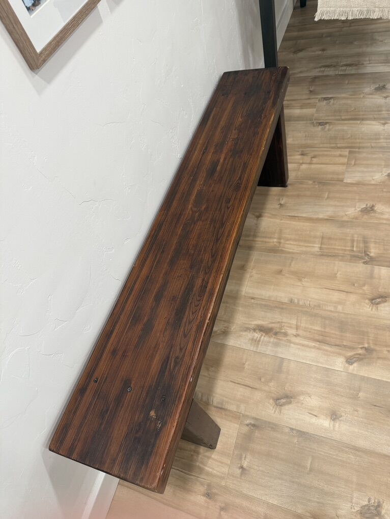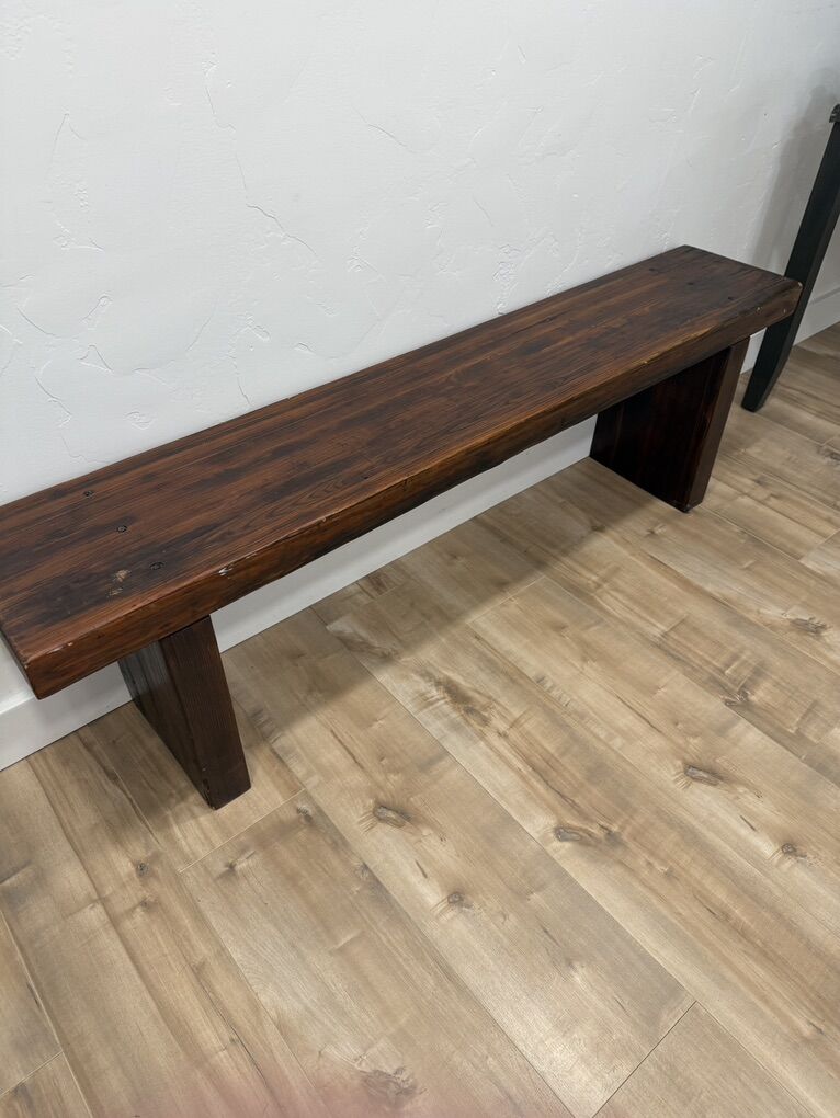 VenmoBeautiful solid wood bench with a rich, dark stain and sturdy construction. Clean lines with a rustic, farmhouse feel. Heavy, well-built piece that works great in a variety of spaces.