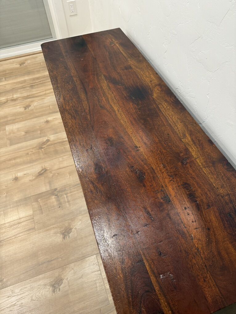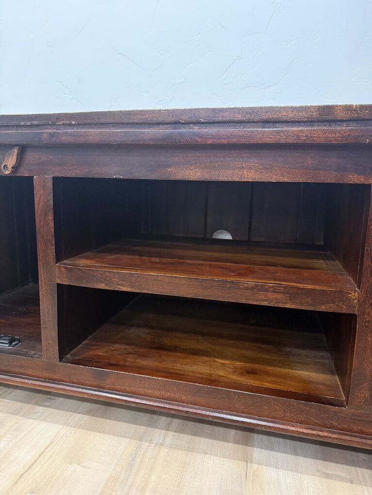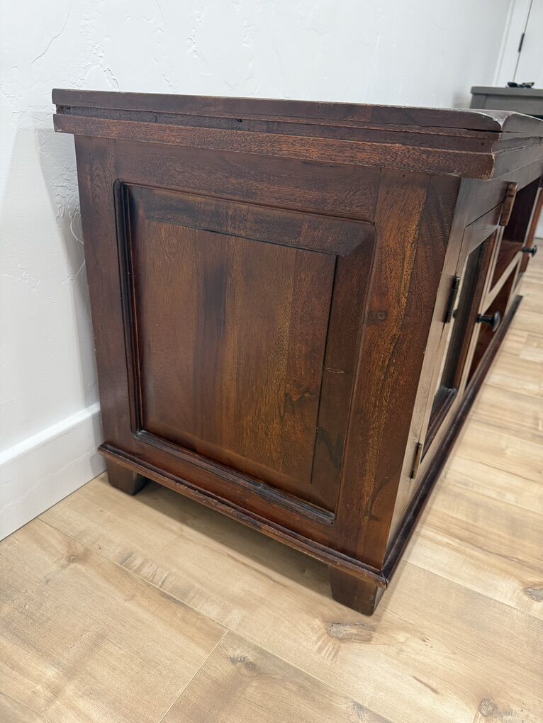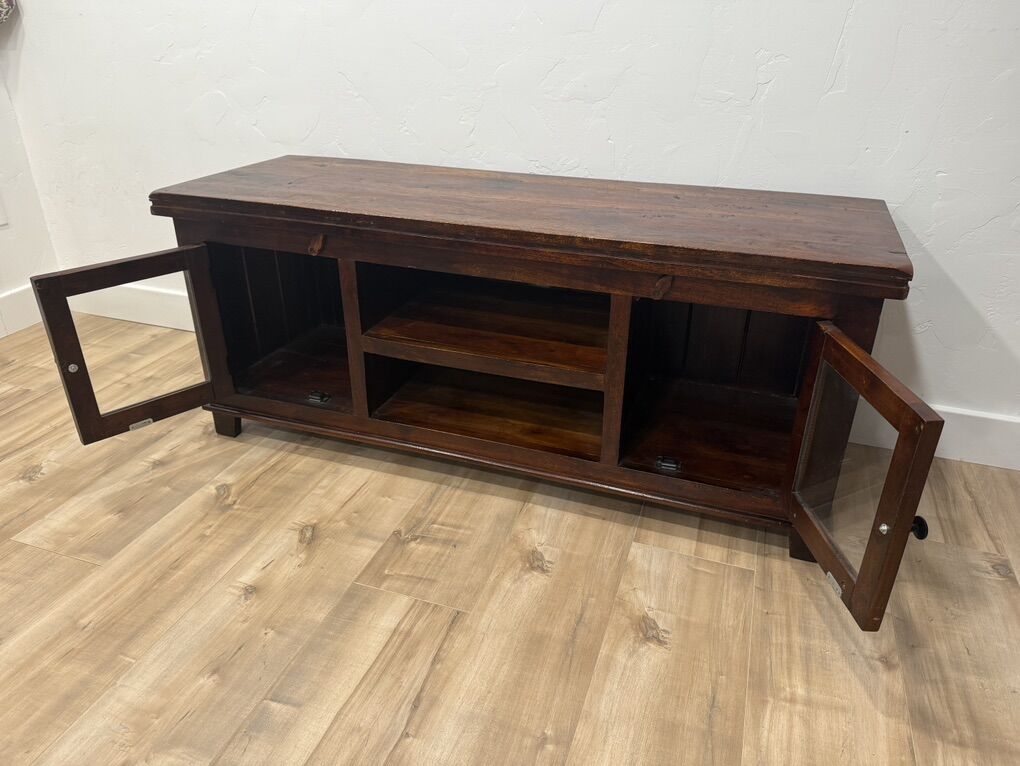 VenmoSolid wood entertainment center / TV stand in a rich dark brown finish. Features two glass cabinet doors on the sides and open shelving in the center—great for media components, books, or décor. Sturdy and heavy piece with a classic, timeless look.