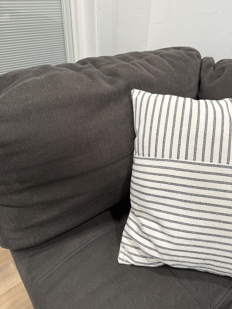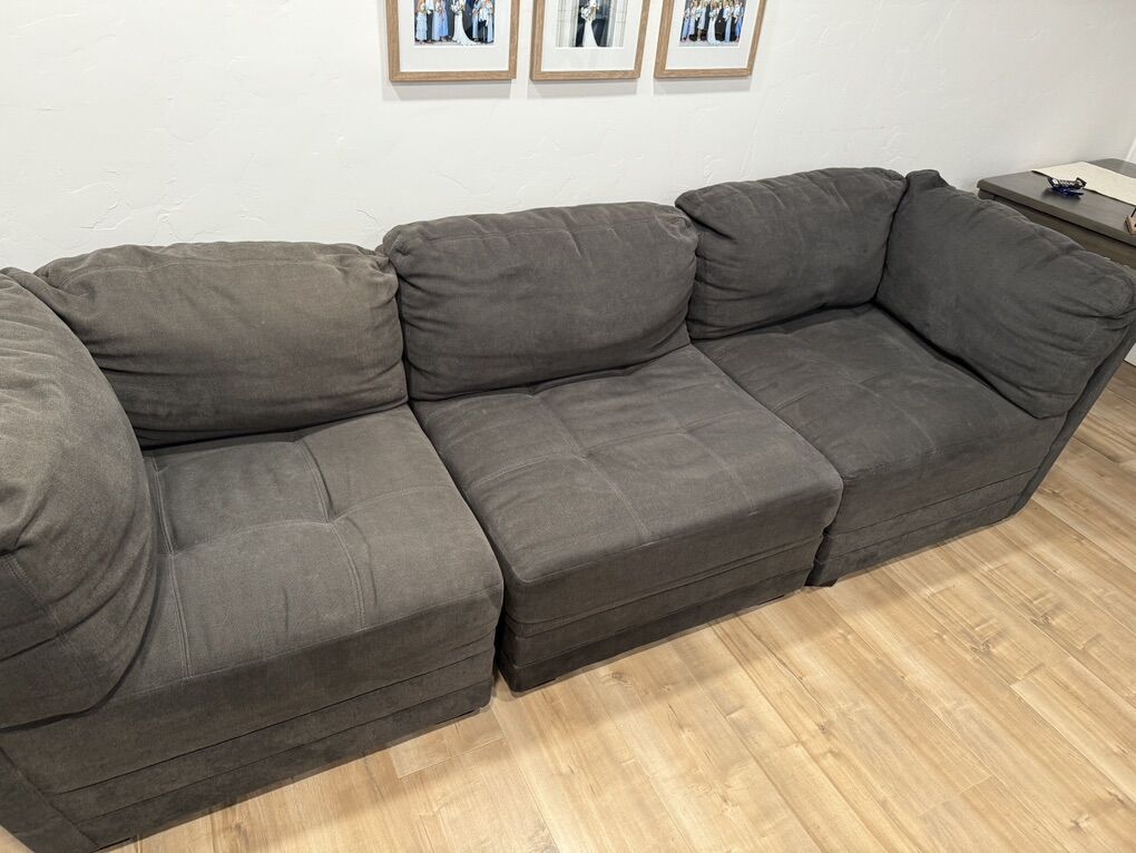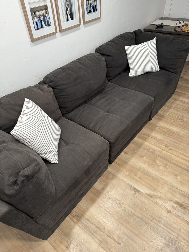 VenmoOversized charcoal gray sectional sofa with deep seating and plush cushions. Extremely comfortable and great for lounging, movie nights, or entertaining. Neutral color works well with most spaces. Includes the accent pillows shown.