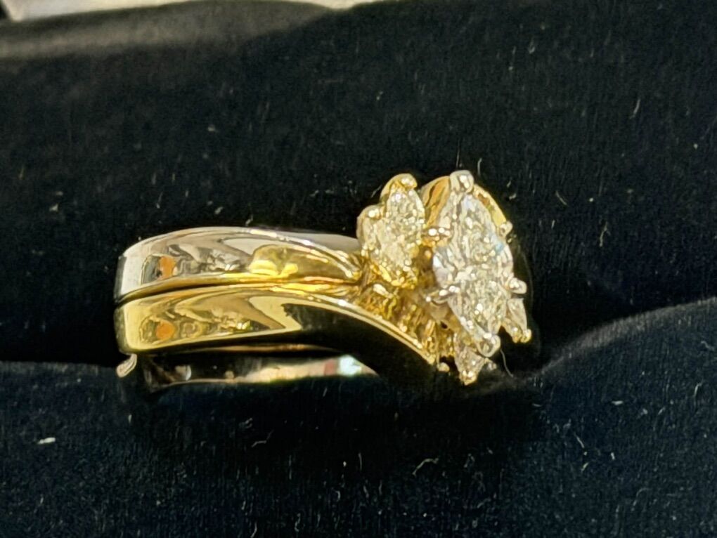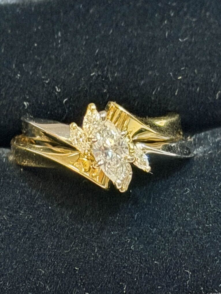 The marquise-cut center diamond creates an elongated, flattering look on the finger, while the accent diamonds add brilliant sparkle from every angle. The two-tone gold set gives this ring versatility and visual depth — elegant, romantic, and truly one of a kind.