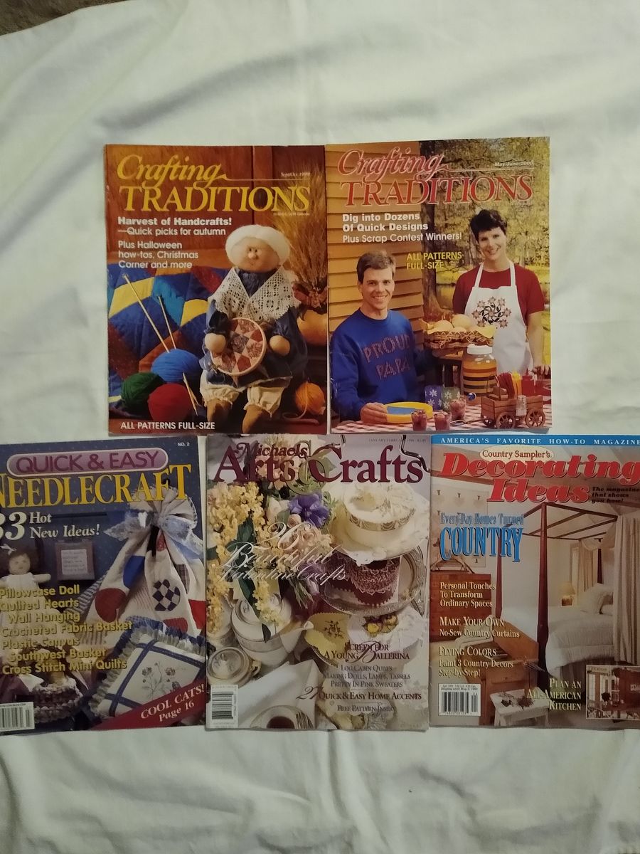 Crafting magazines include dozens of projects and full-size, pull-out patterns. A wide variety of patterns for counted cross stitch, knitting, quilting, tole painting, crochet, embroidery, baking, home décor, applique, and much more. Each magazine is $2. Please text if you would like more photos. Cash only please.