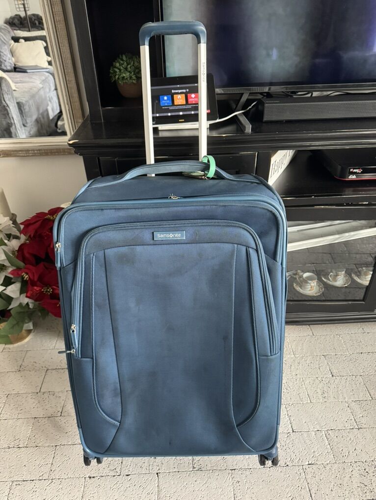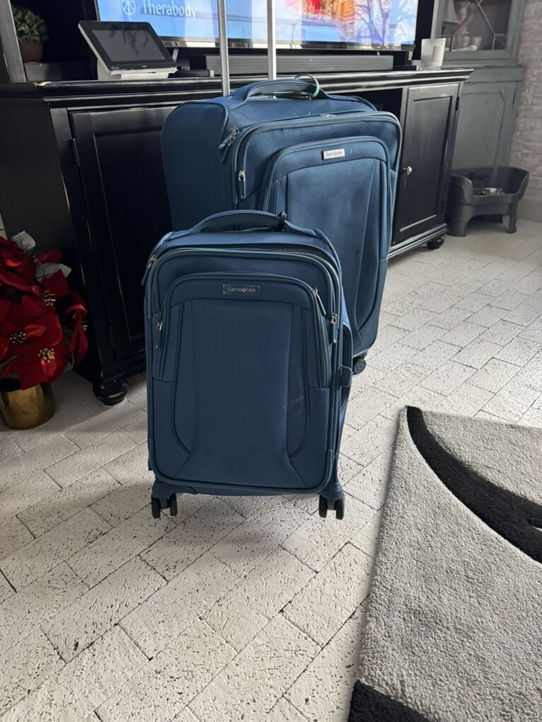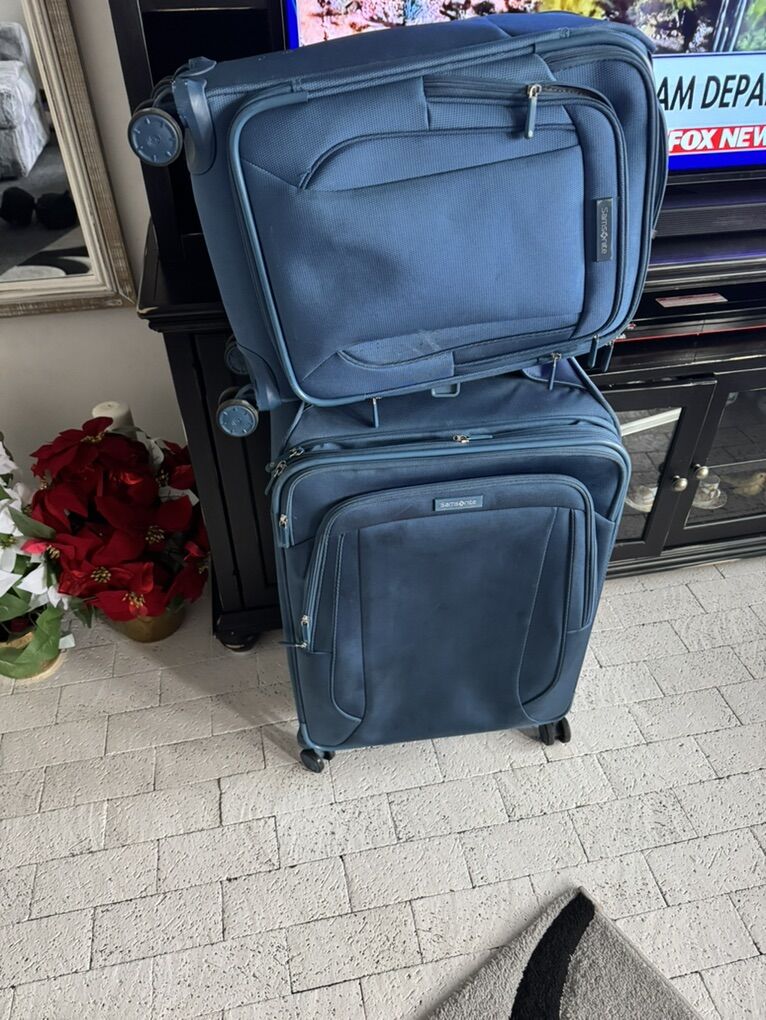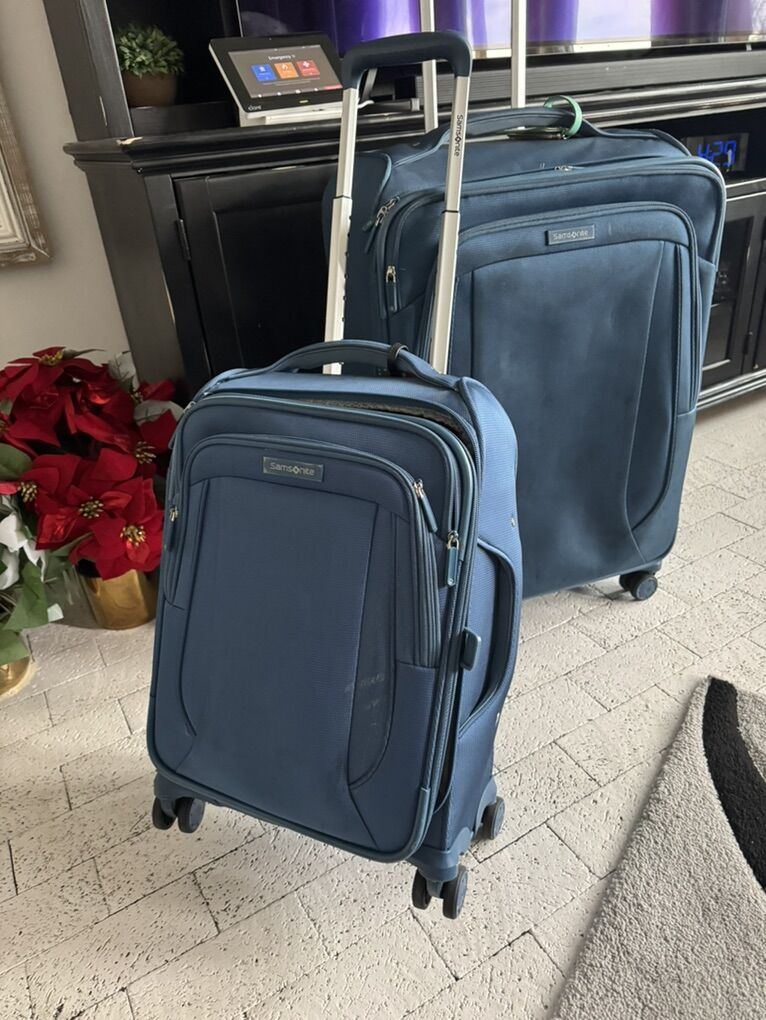 VenmoMatching Samsonite softside luggage set featuring spinner wheels and expandable compartments. Includes one large suitcase and one carry-on size. All zippers, handles, and wheels function properly. Clean interior, light cosmetic wear only.