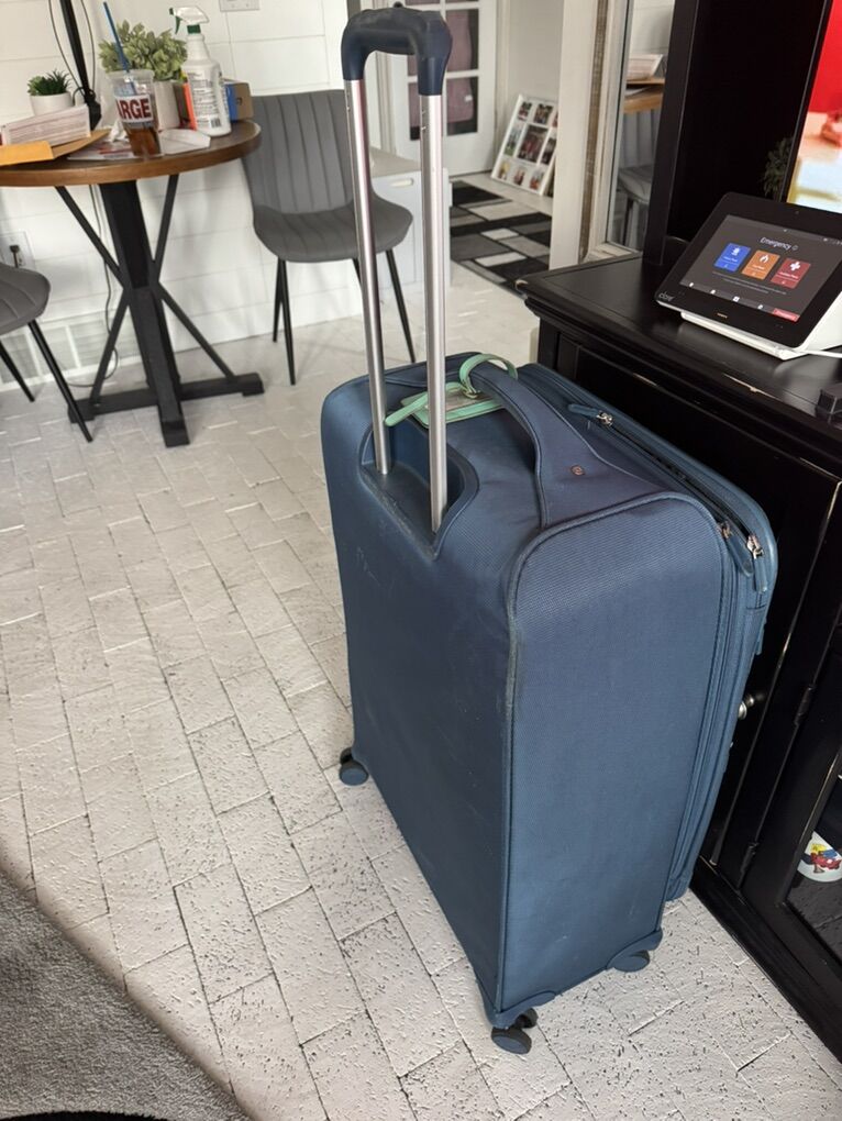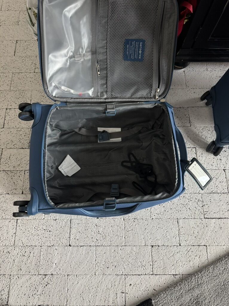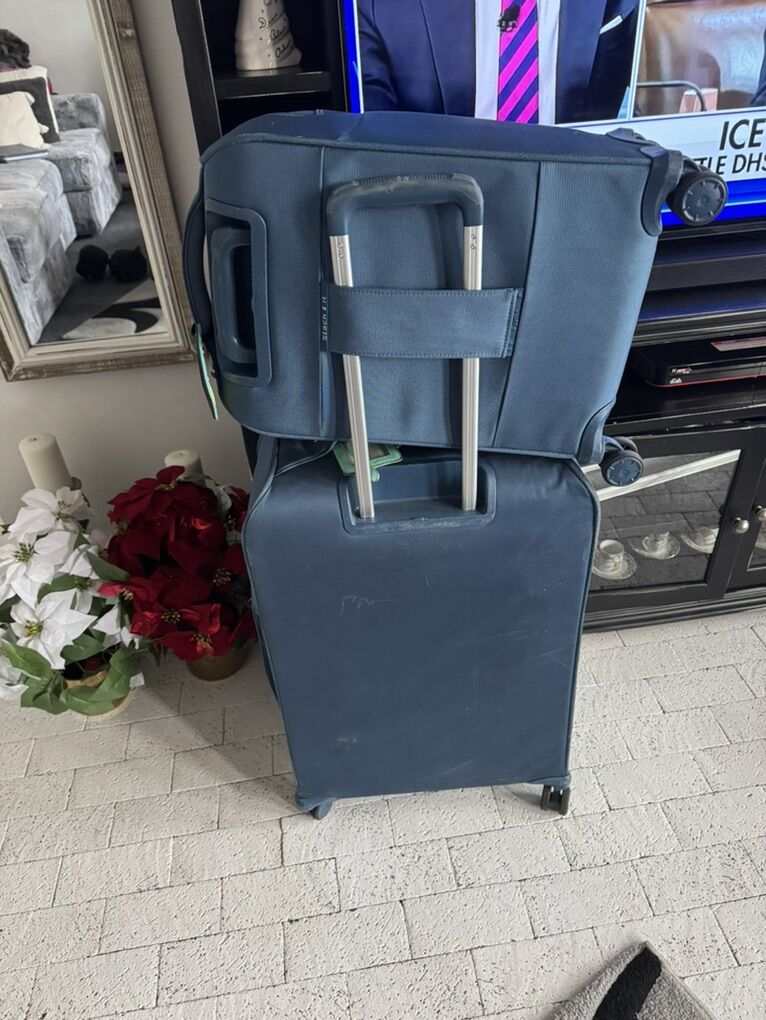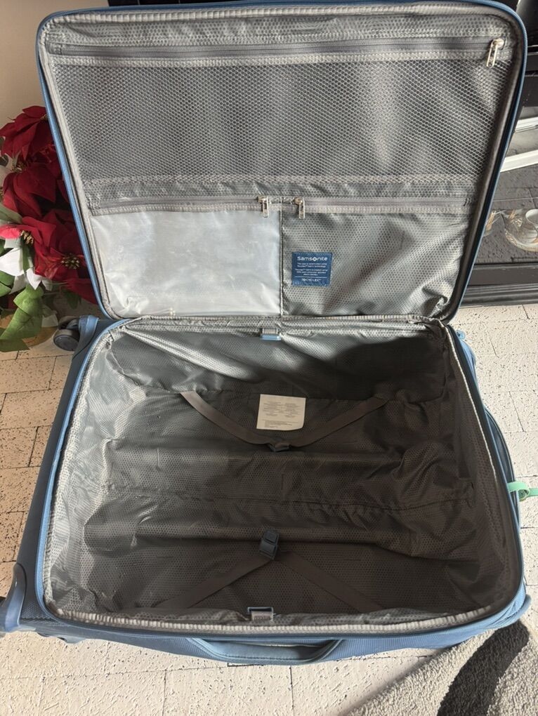 VenmoMatching Samsonite softside luggage set featuring spinner wheels and expandable compartments. Includes one large suitcase and one carry-on size. All zippers, handles, and wheels function properly. Clean interior, light cosmetic wear only.