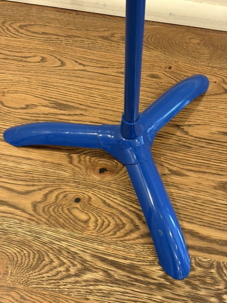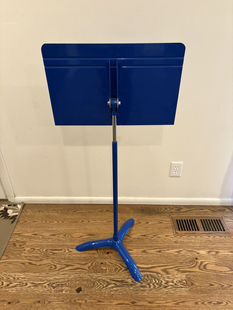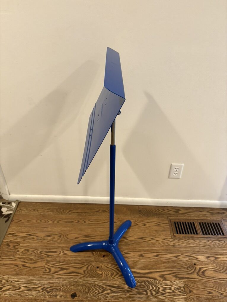 Manhasset #48 Music Stand in glossy blue, with removable cup holder. The classic, beloved stand, heavy-duty aluminum, stable, simple, high-quality. Desk swivels and rotates completely, stand adjusts up and down easily. Very good condition, one small ding on base (see photos). Text only. Cash or Venmo.