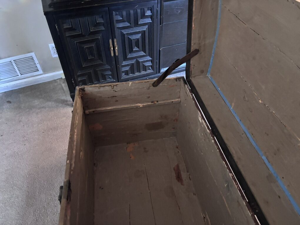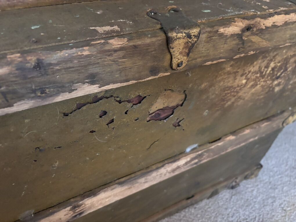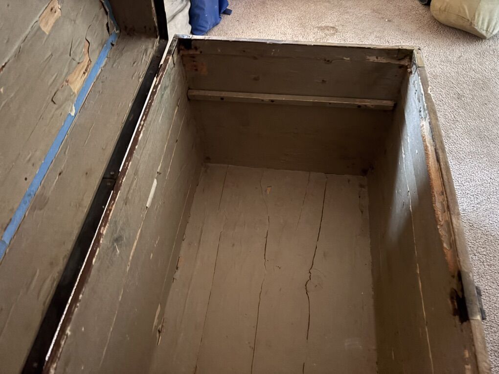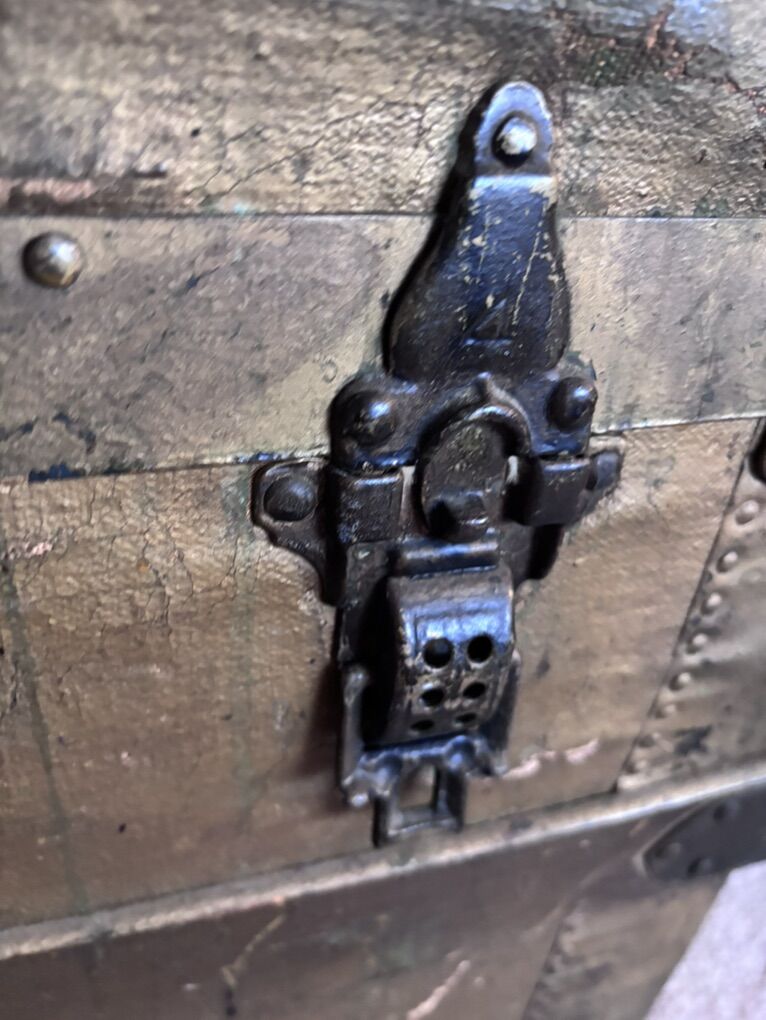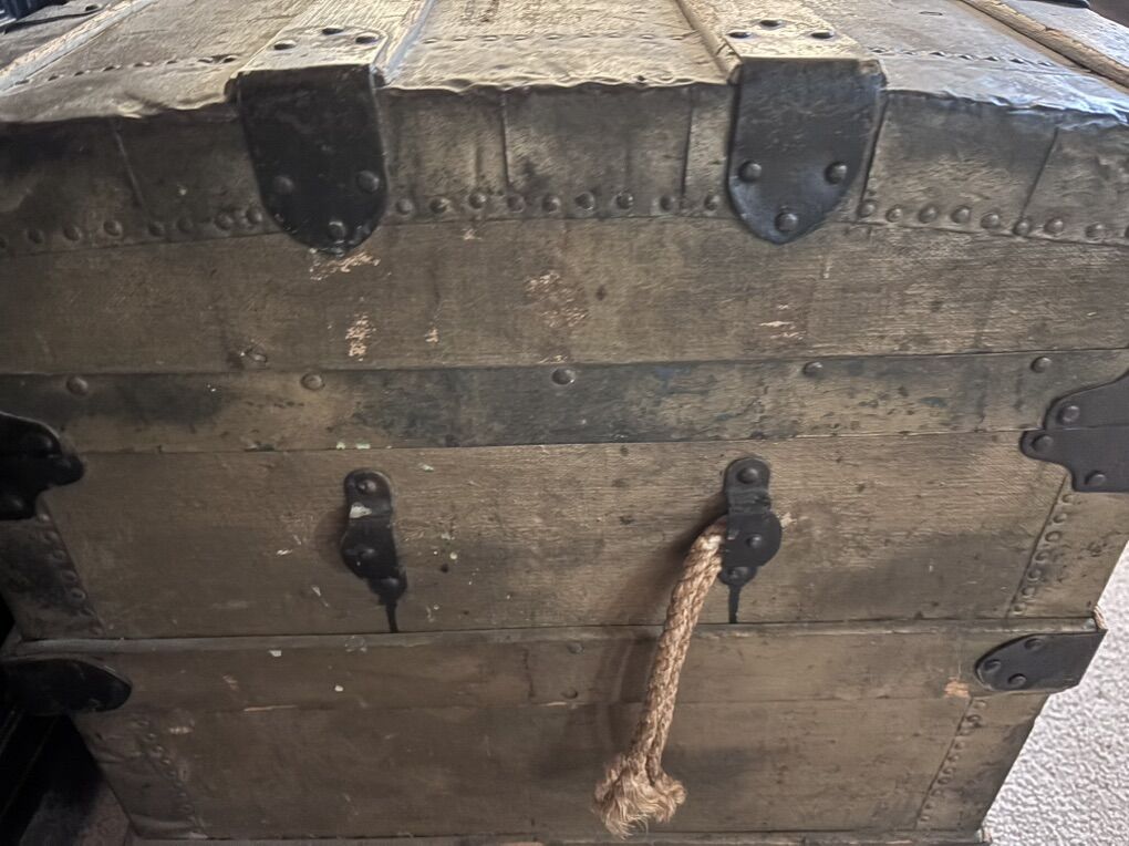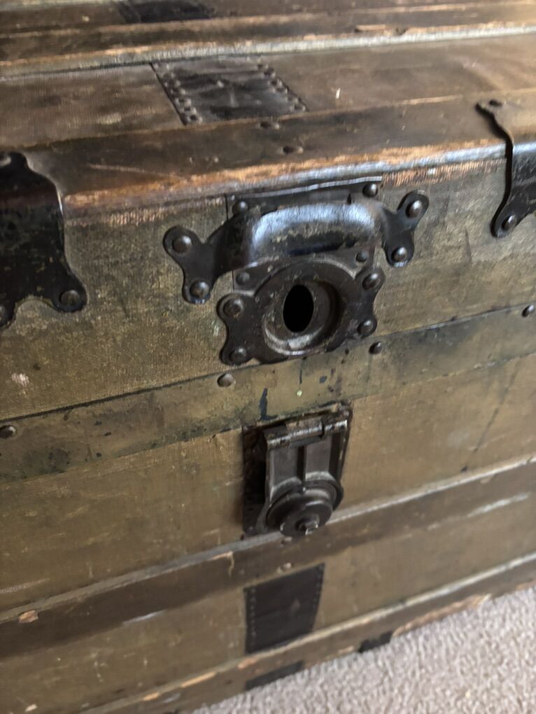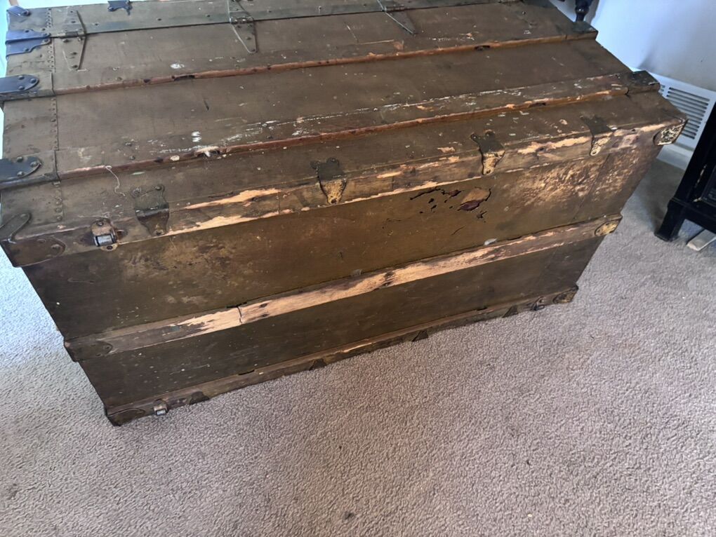 VenmoThis is a nice old trunk, brought west from an attic in Brockport, New York., Where it had stored the belonging of a World War I veteran, (all of that military and memorabilia has gone elsewhere). There’s no key, the rope handles that replaced the leather handles are hanging on. There’s wear to surfaces. The inside is clean, and the frame and hinges are sturdy. 21 inches wide. 24 inches tall. 42 inches wide.