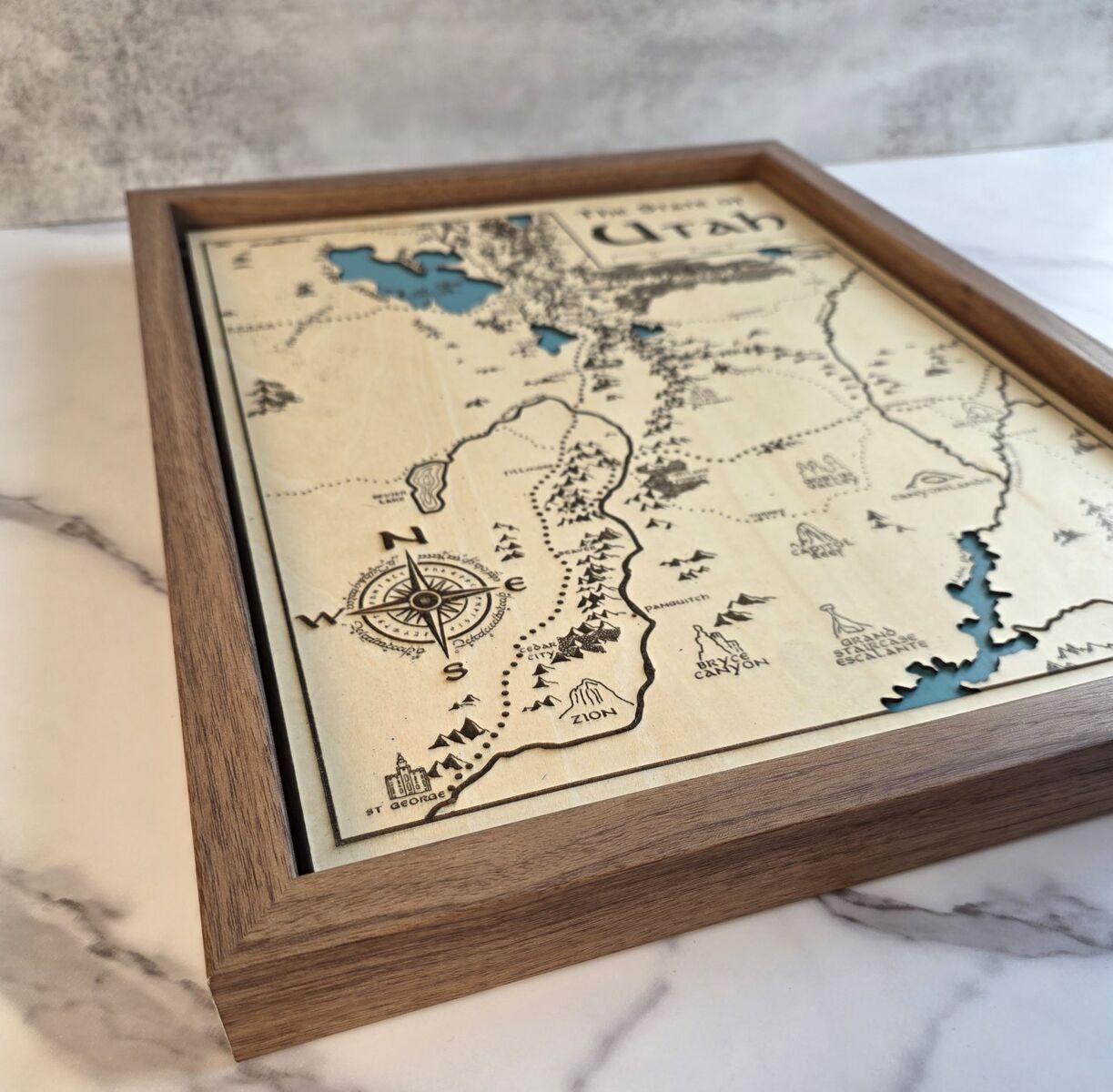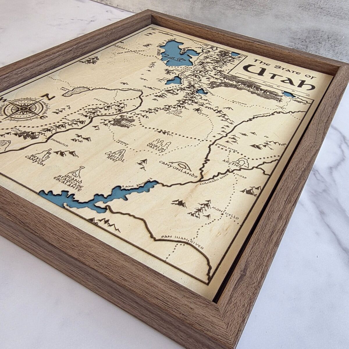 Multi-Layered Depth Each map is laser cut and engraved from natural wood, featuring painted lakes, engraved mountains, forests, national parks, and key cities and towns. Includes all five Utah National Parks (Arches, Bryce Canyon, Canyonlands, Capitol Reef, Zion), plus iconic landmarks like Goblin Valley and the High Uintas.