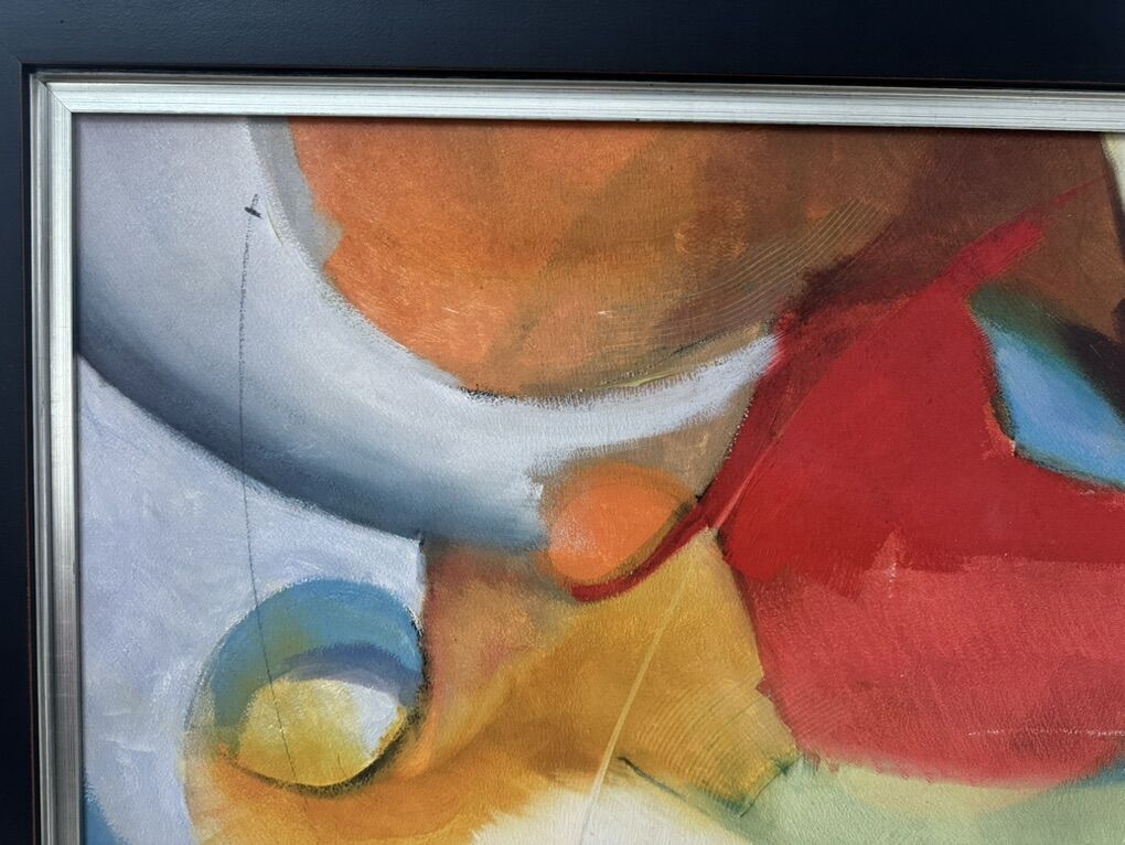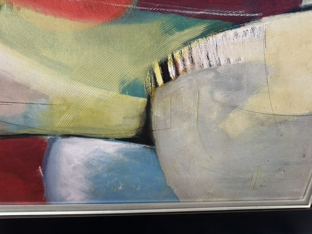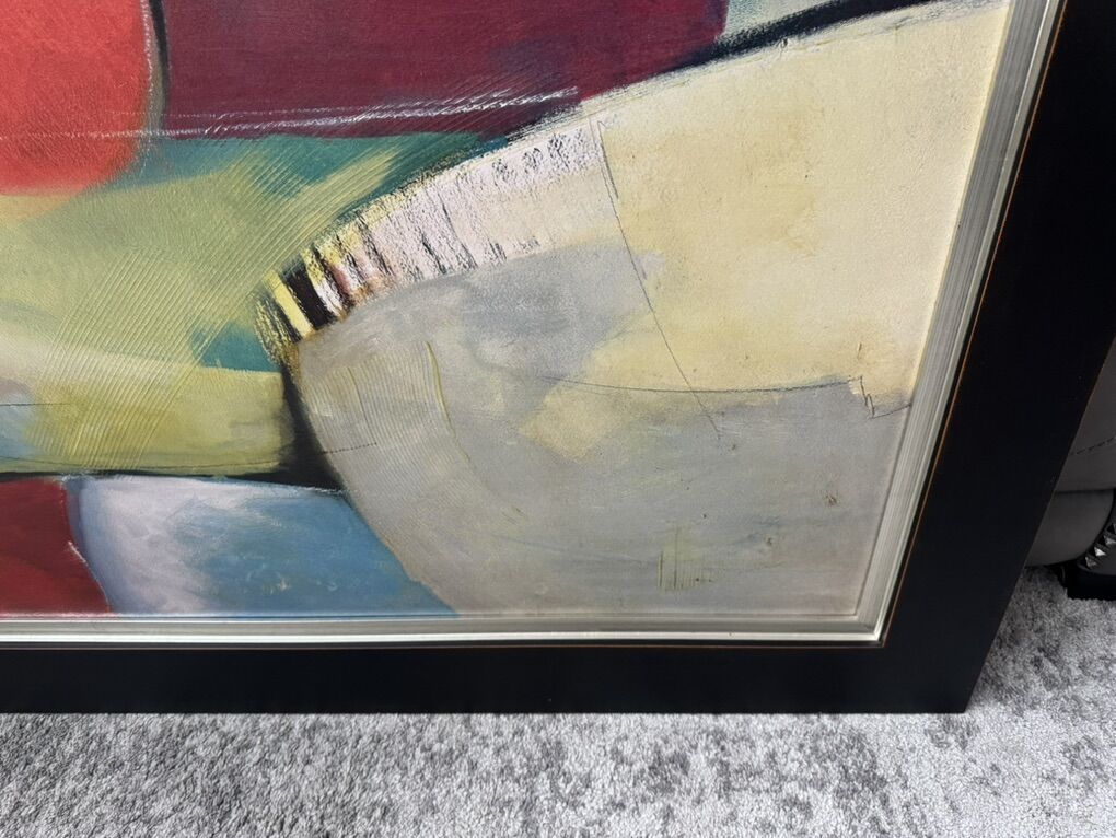 This large-scale abstract features bold blocks of red, golden yellow, teal, and warm neutrals with a textured canvas finish that adds depth and dimension. Professionally framed in a substantial black frame, it makes an impactful focal point in a modern, contemporary, or mid-century interior.