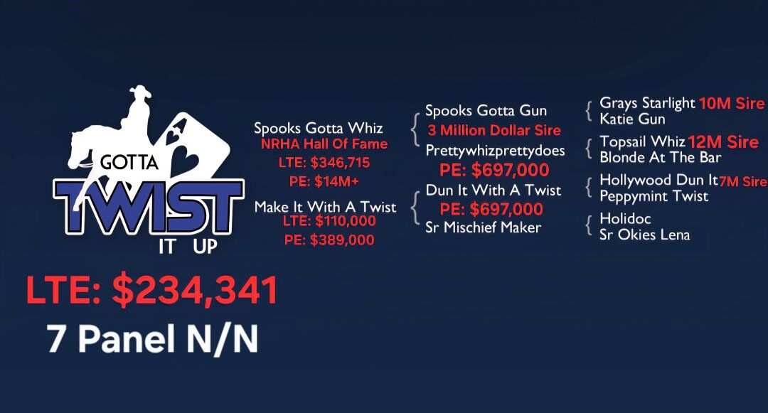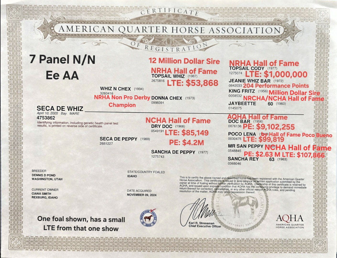Due in April 2026! Dual registered AQHA and APHA foal. 7 panel N/N by parentage and could be buckskin, bay, palomino or red. Foal will be NRHA, NRBC and NARS nominated. Sire: Gotta Twist it Up (LTE: $234,341) Dam: Seca de Whiz "Whiz" has super smooth gaits and boasts the sweetest laid back personality. She's athletic as can be and she passes that on to her offspring as well as her great mind. She's uncomplicated, an easy keeper/breeder and gets along with everyone. Her lines have excellent longevity, her sire lived into his 30's still being ridden and Whiz looks half her age (currently 21) and is still sound and being ridden.
