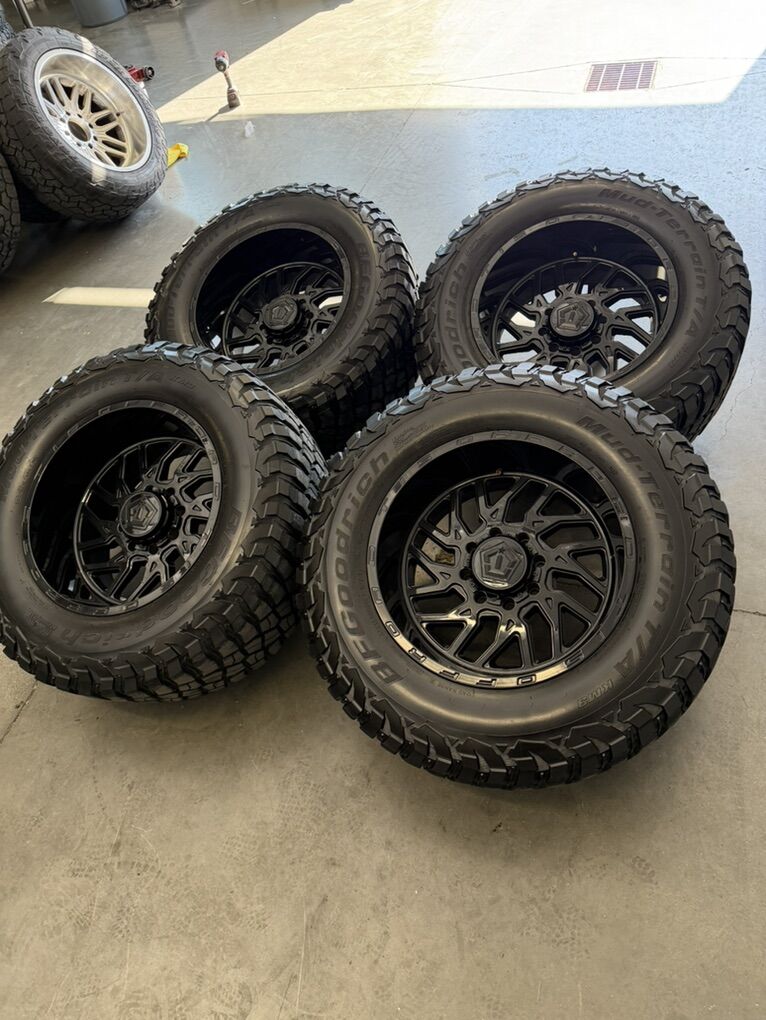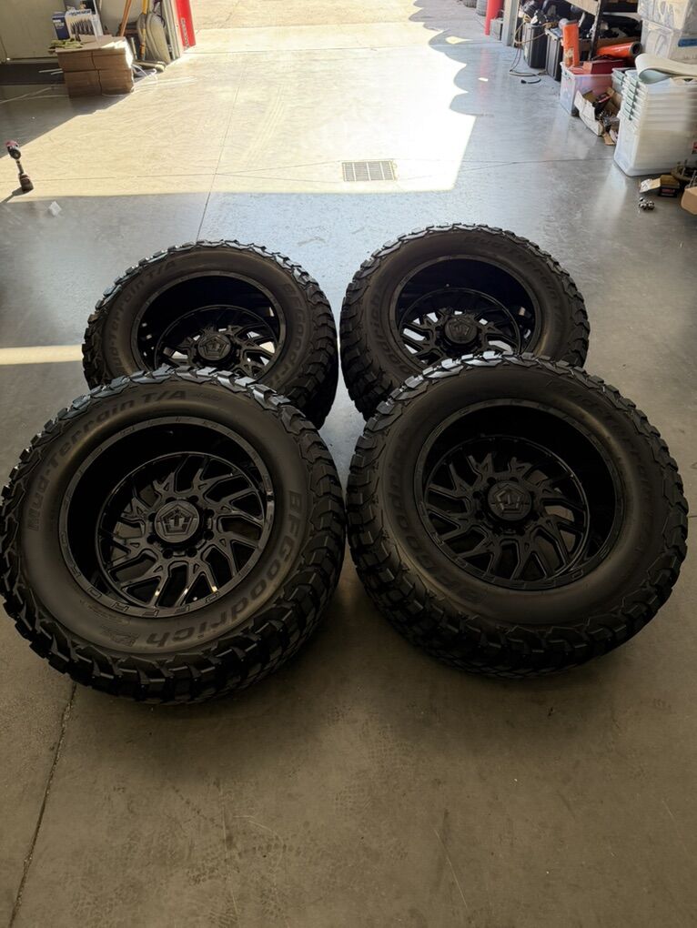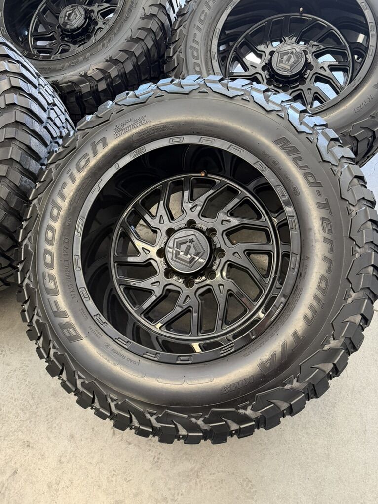 Wheels are 20x12, -44 offset, TIS 544, all gloss black finish on them. Wheels are in perfect shape, no curb rash or damage on them. Wheels look as if they just came out of the box. All of the center caps are also included and in perfect shape as well. Tires are 37x13.50r20 BFG mud terrain, load range E, 10ply, top of the line tires. These tires alone are over $2300. Tires are in amazing shape with about 70% tread left.