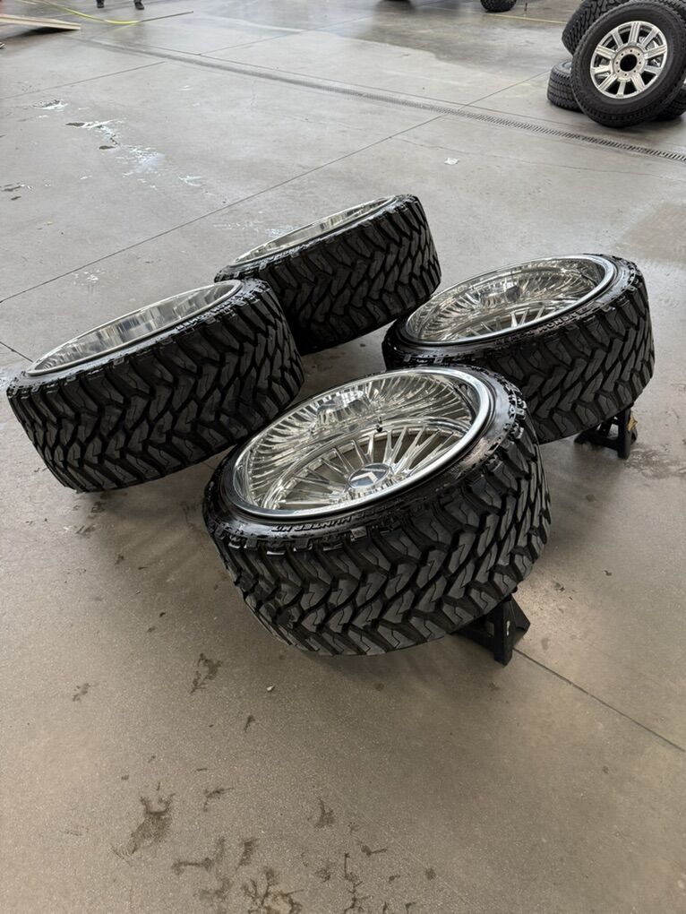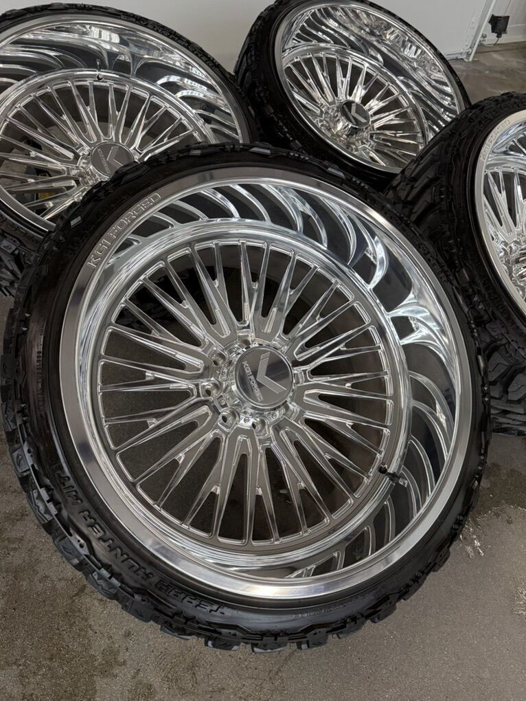 Wheels are 26x14 KG1 forged “allure” billet forged aluminum wheels, -76 offset, one of the hottest wheels on the market. Wheels are in perfect shape, no a dings or scratch on them, they look as if they just came out of the box. All the center caps are included. Tires are 35x13.50r26 venom m/t, load range E, 10ply, amazing riding, great looking tires, less then 1k miles on them so they are pretty much brand new. $6000 on plastics caps $6500 with the floating caps