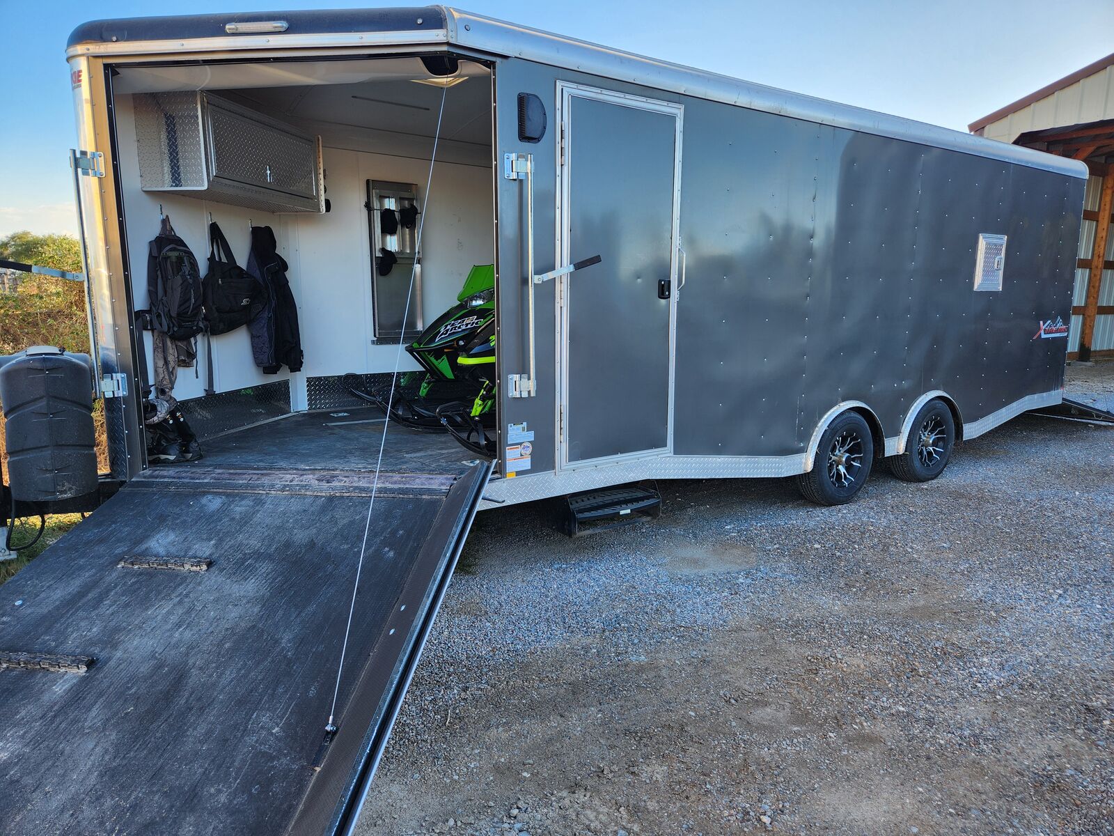 Zelle22' Box. 4' Nose. 29' from tongue to back door. Heater. Charging ports. Front cabinet and 2 benches. 2 propane tanks. Fuel door. 81" between wheel wells. 96" inside width. 79 1/2" rear door height. 2 5/16" ball.