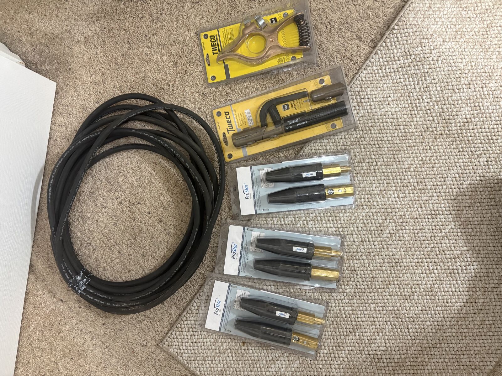 35' heavy duty 1/0 welding lead, new stinger, new ground clamp, 3 new tweeco connector! Brand new full setup, 240-480 volt Single phase/3 Phase welder