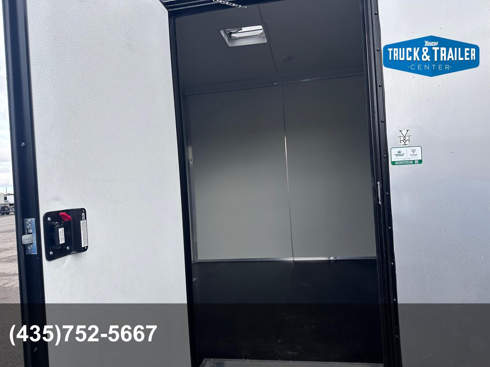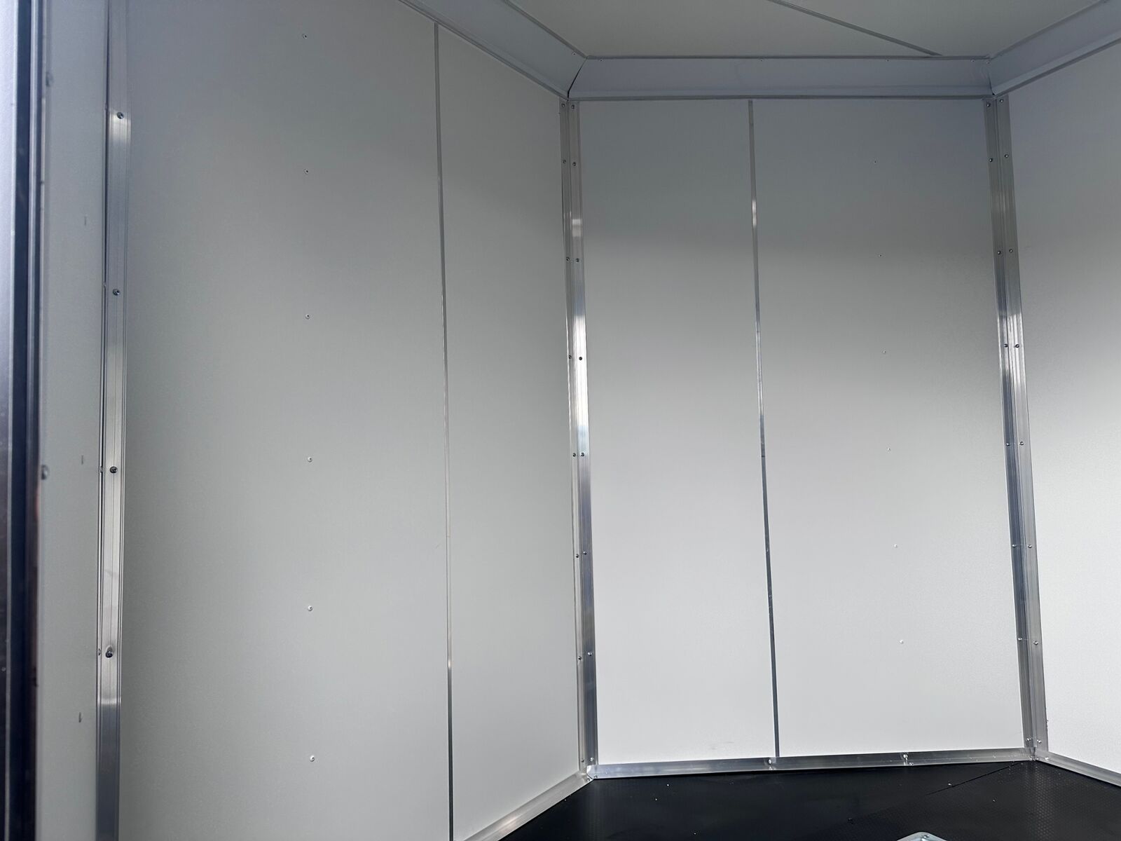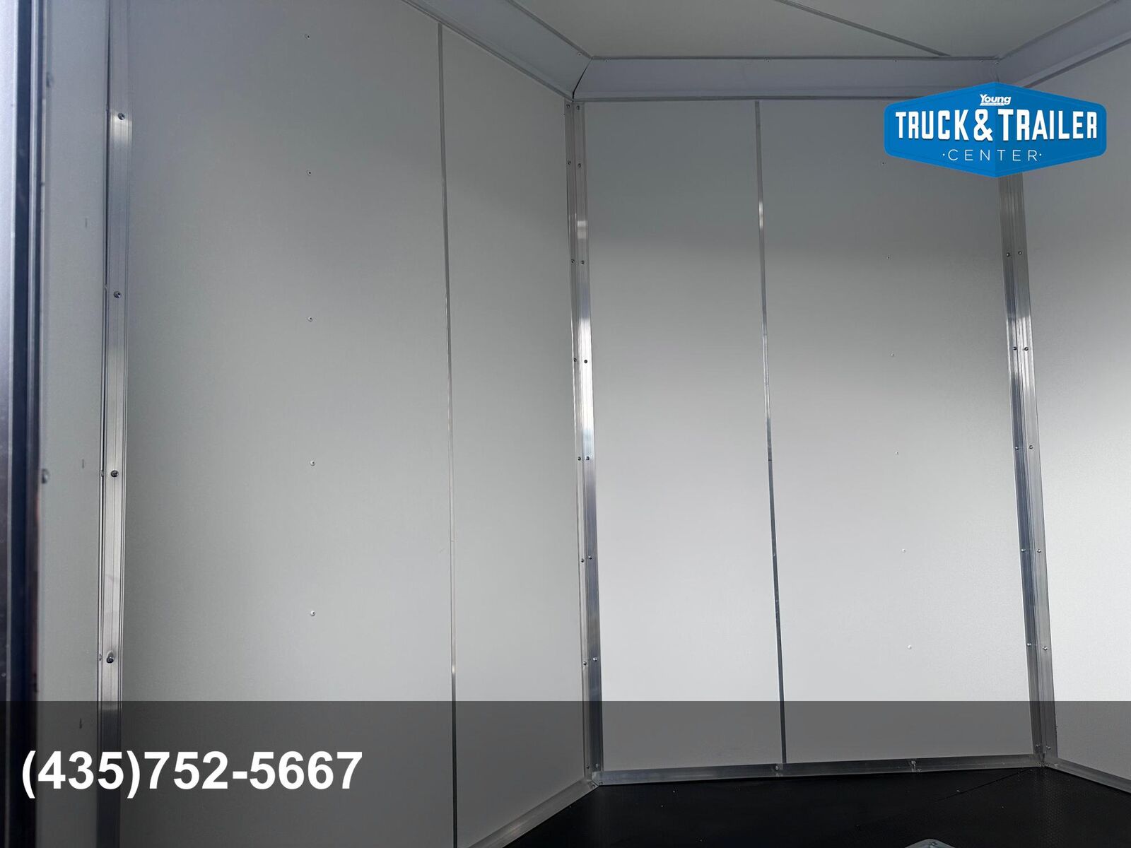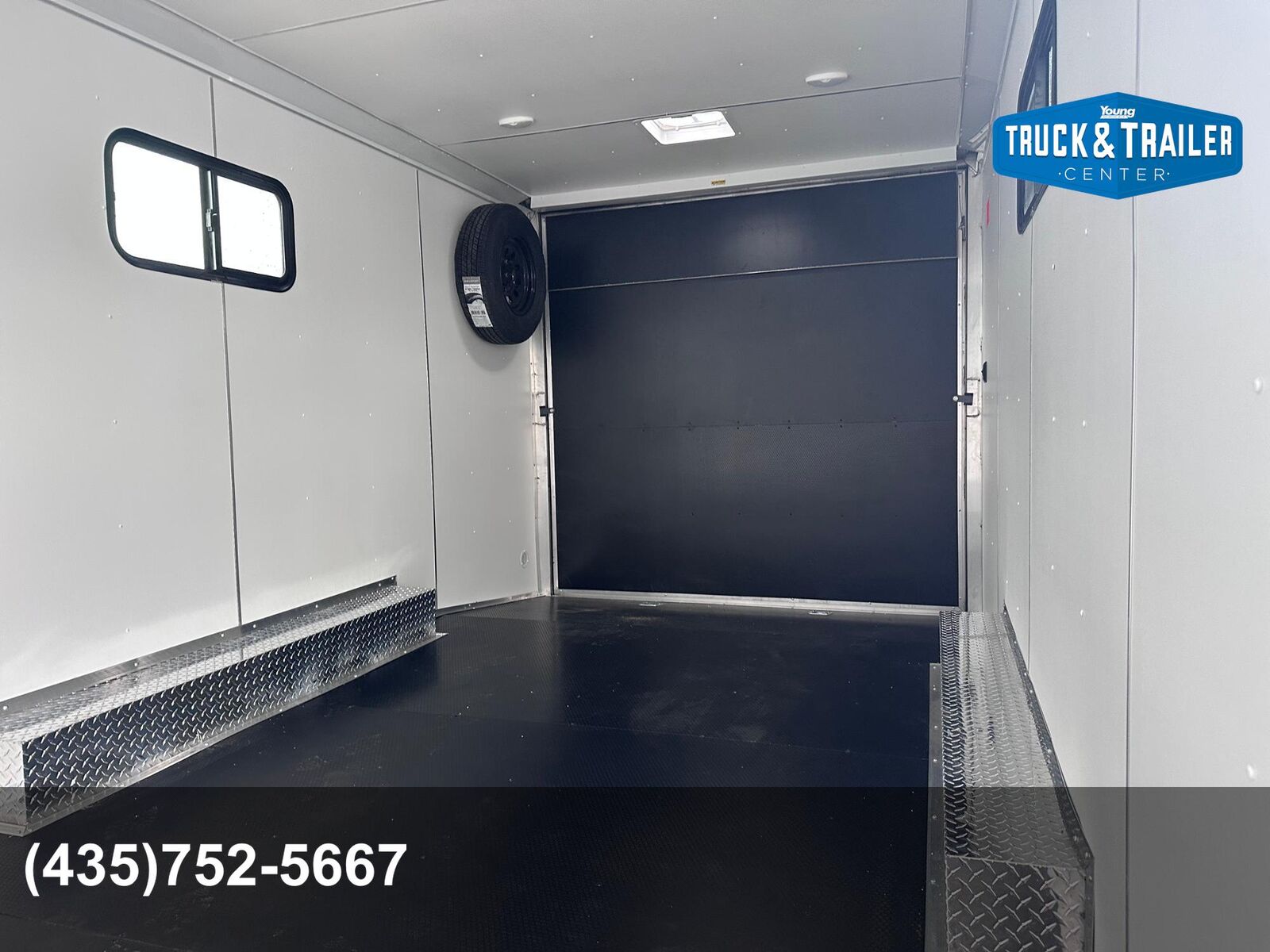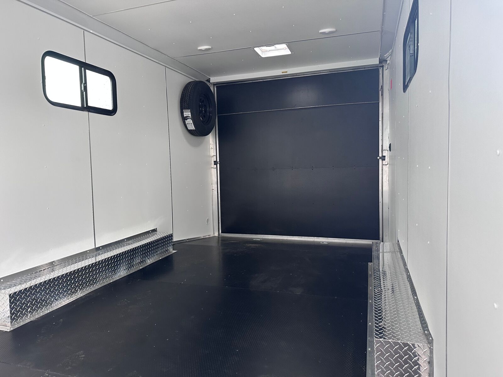 8.5X20 Car Hauler 5K Axles All Aluminum Frame White Walls and Ceiling Insulated Walls and Ceiling Hex Ply Flooring Windows Interior Spare Tire Black Out Trim