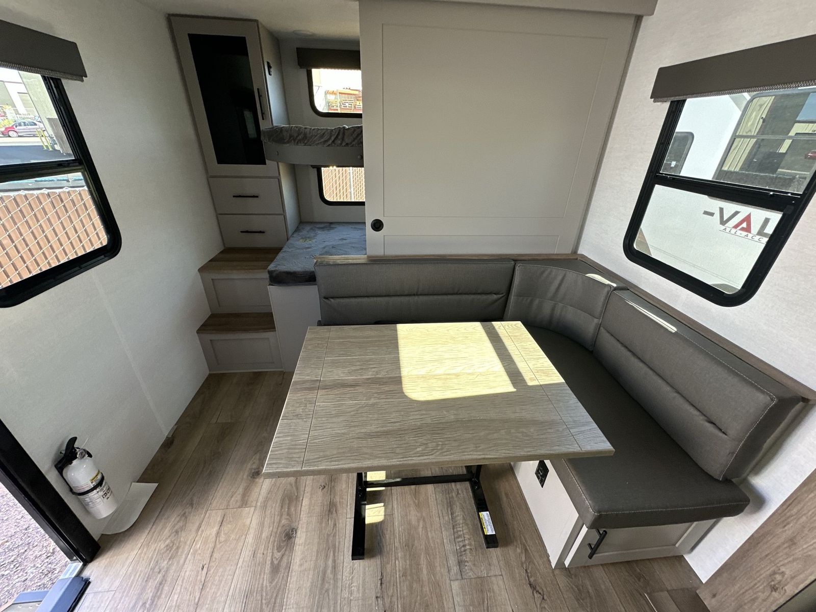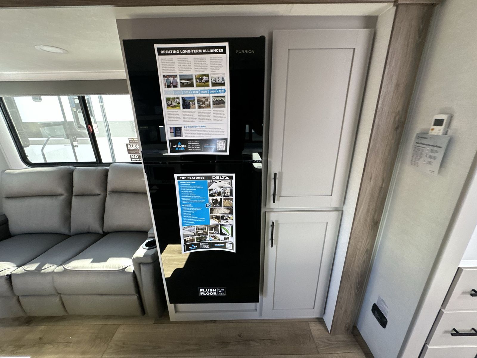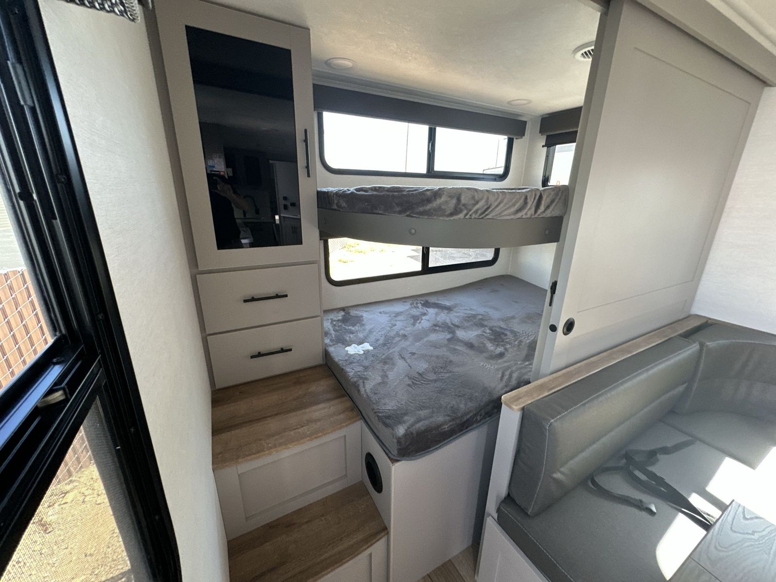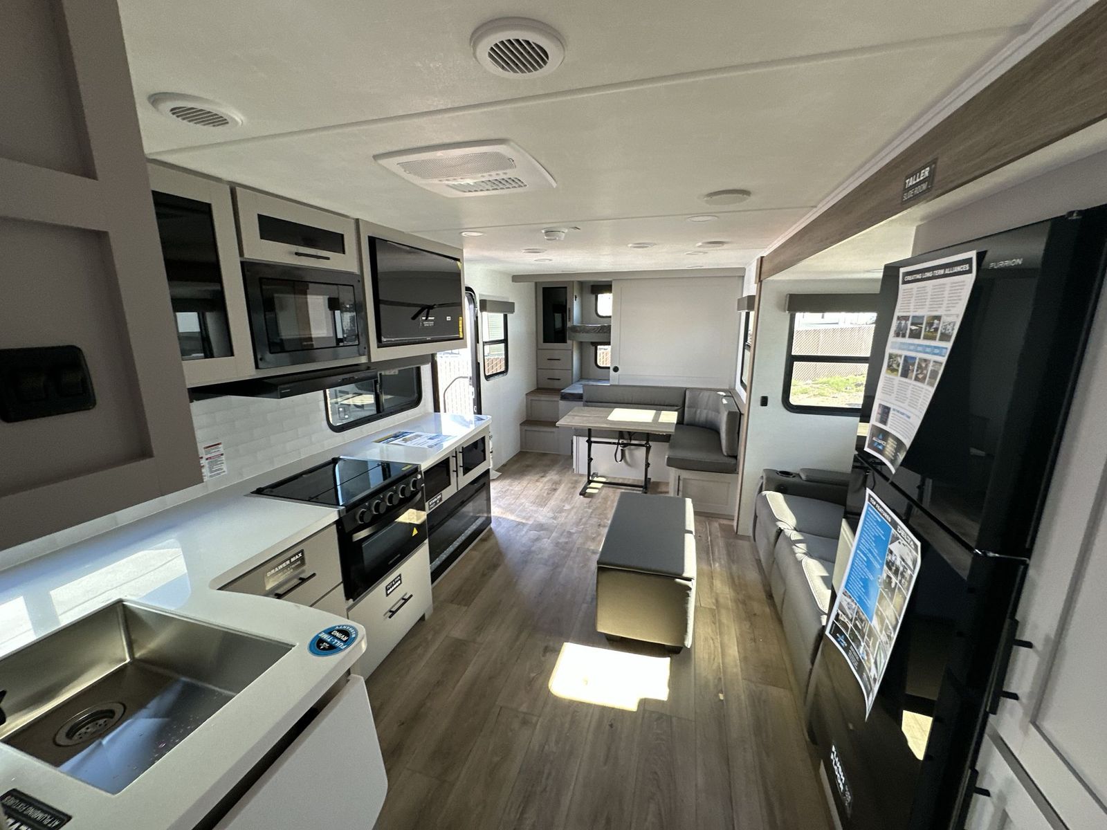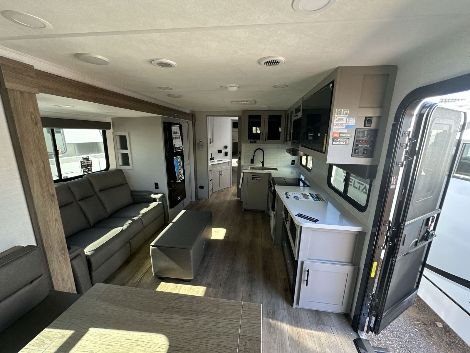Alliance RV Delta travel trailer 291BH highlights: Outdoor Griddle Two Entry Doors Walk Through Bathroom L Shaped Kitchen This Delta 291BH model offers a thoughtfully designed layout perfect for comfort and convenience on the road. At the front, you'll find a private bedroom featuring two nightstand wardrobes, and additional overhead storage for all your essentials. Moving through the walk-through bathroom, enjoy a 30" x 36" shower and a soft-close porcelain toilet with foot flush. The central living area is ideal for relaxing or entertaining, with a 68" theater seat that has the option to be a tri-fold sleeper sofa for added sleeping space if needed. Along with a L-shaped dinette, and a 36" ottoman, all centered around a 40" TV. At the rear we have, two 46" x 74" bunks with steps that provide extra-sleeping space and easy accessibility along with a wardrobe for added storage, making this RV perfect for families or group travel. Form and function work together with every one of these Alliance RV Delta travel trailers! They are built with a walk-on roof with a seamless PVC roof covering, Mylar reinforced exterior seals, and a heated and enclosed underbelly to protect your unit. The commercial grade vinyl flooring will be easy to clean, and the oversized atrium windows throughout let in plenty of natural sunlight. With 62 cu. ft. of drop frame pass-through storage, you can bring along all of your essential camping gear plus it has USB charging for more convenience. There are many at home interior conveniences including a Bluetooth speaker, USB charging throughout, and even a pull-out kitchen trash can. Come find your favorite model today!