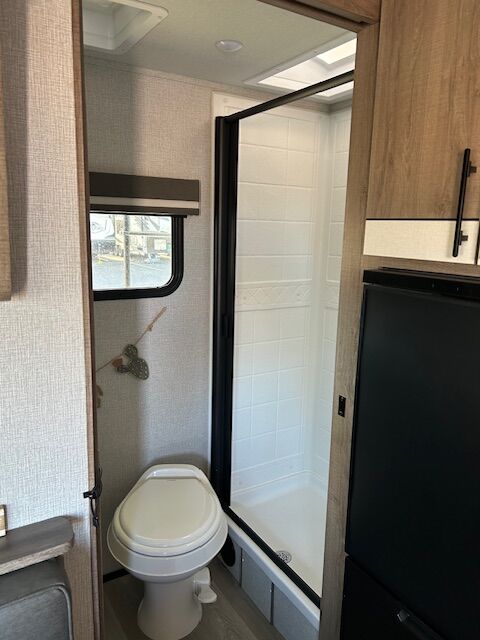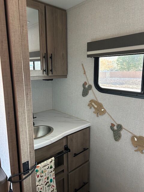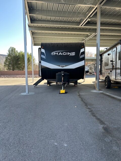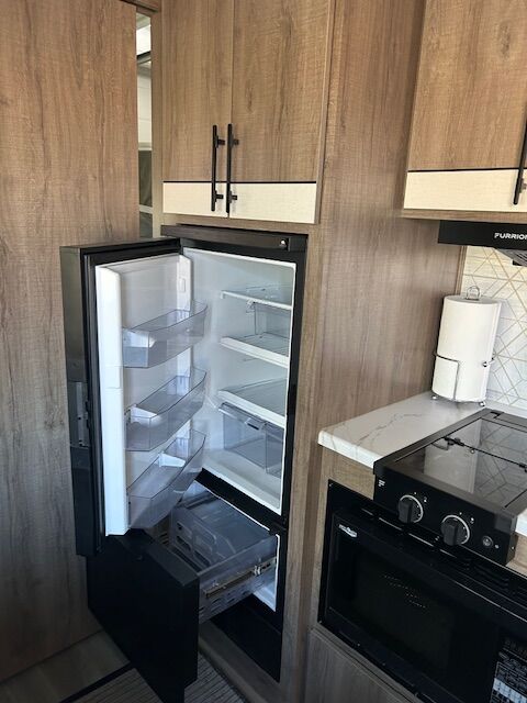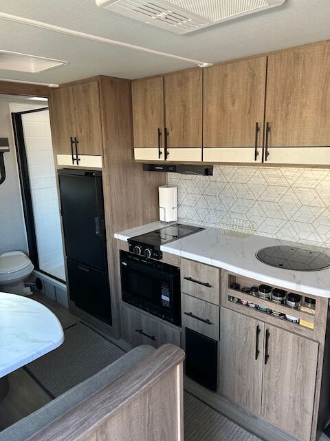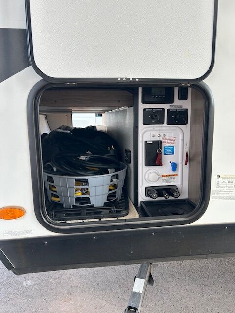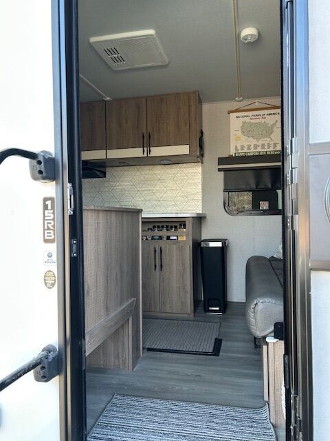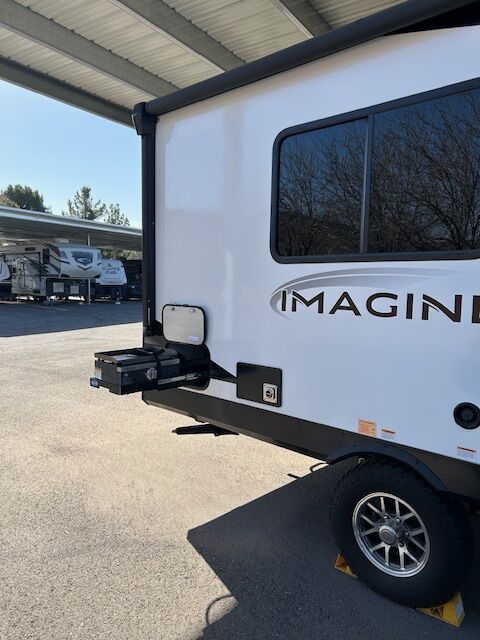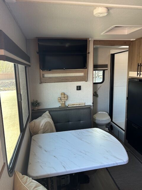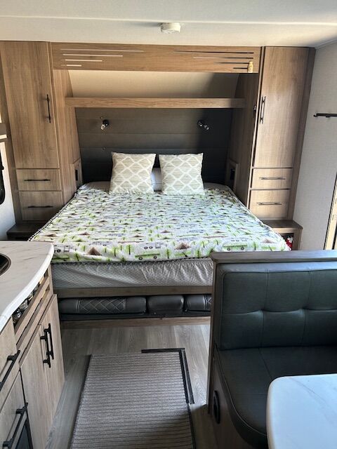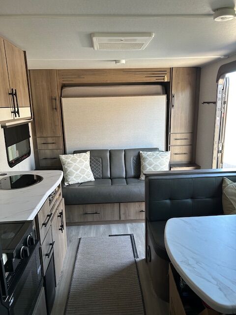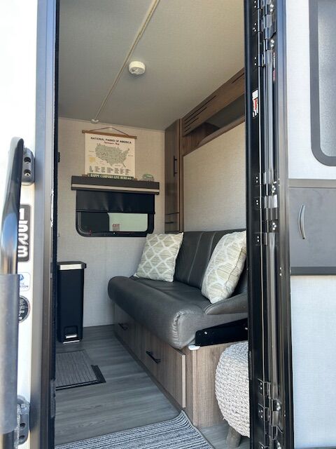 2024 imagine 15RB Trailer ~ Queen size Murphy bed in front that also converts to a couch, the bed is surrounded by overhead cabinetry and bedside storage compartment, so you have plenty of room to store hanging clothes, personal items and other essentials. There are also USB charging ports in each cubbyhole on either side of the bed. A cozy dinette table that seats two or four and can also be converted into a Bed. The kitchen area has a two-burner cooktop sink and convection oven microwave refrigerator with separate freezer drawer. The rear bathroom with shower, toilet and large back sink area. The trailer includes a state-of-the-art control panel that allows easy monitor and adjustment of an essentials system such as water levels heating and power. The climate control has 13 500 BTU air-conditioning unit and includes a 20,000 BTU furnace. The trailer comes with solar for Boondocking camping. A large storage pass through in front of trailer, two propane tanks two batteries, outdoor cooking grill, large awning with LED lights and exterior wash down hose. The hitch has an anti-sway setup and power jack.