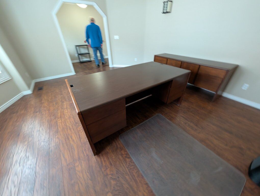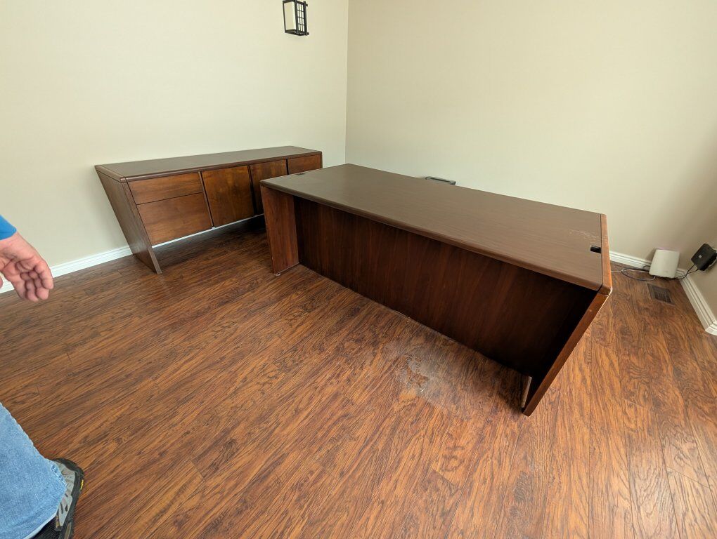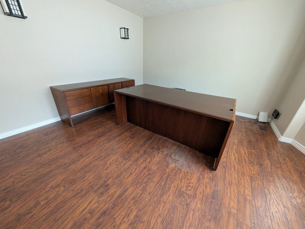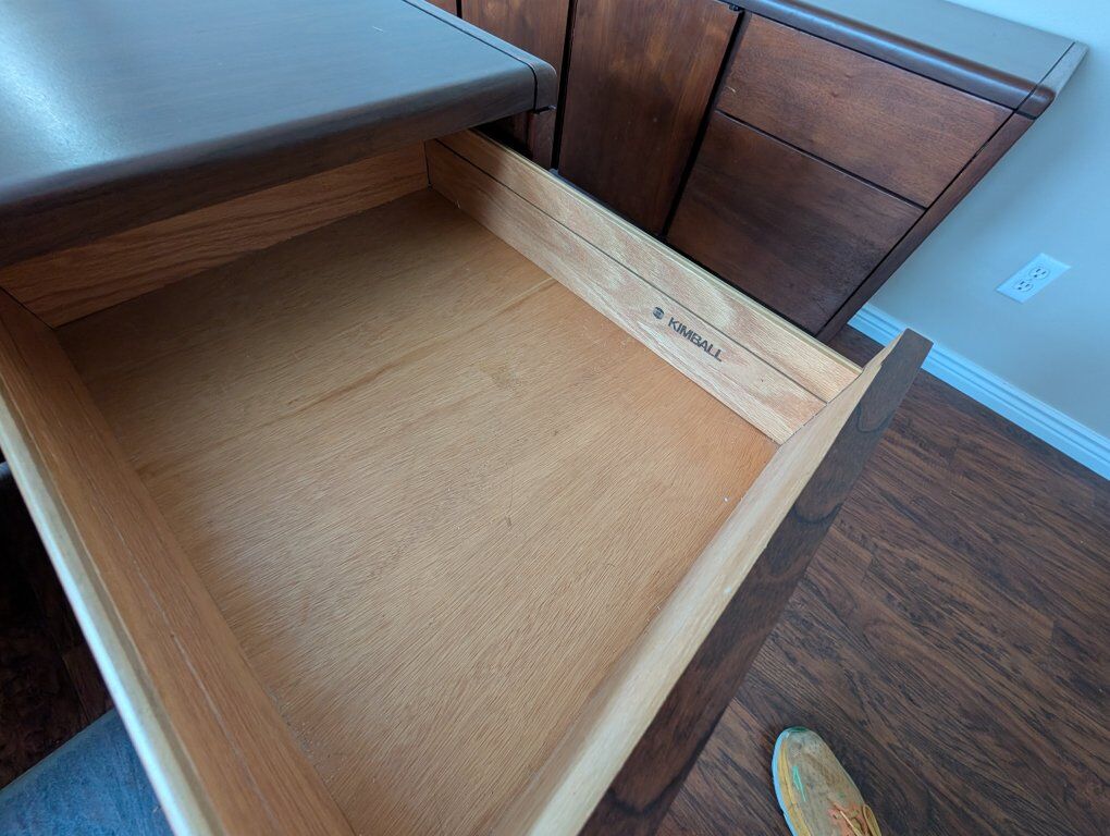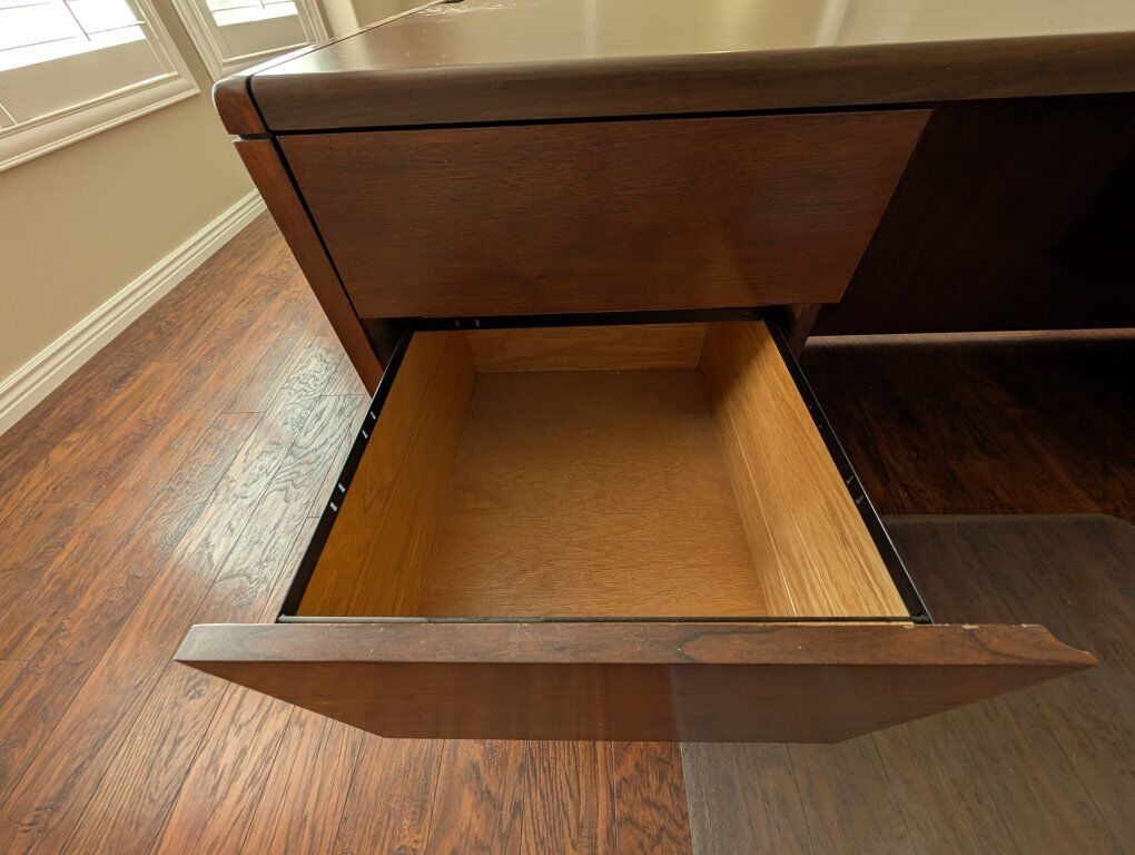 PayPalSolid wood desk in good condition. Missing small metal cord cover on the top right side of the desk. Made by Kimball.