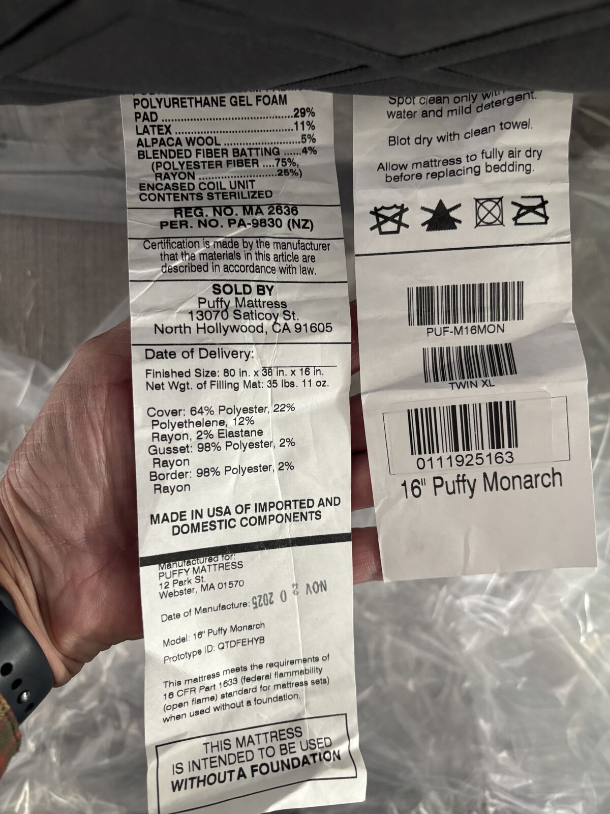 VenmoLike new Puffy Monarch Twin XL mattress. Slept in 4 nights. Manufactured in Nov. 2025 (see photo). If the ad is up, I still have it.