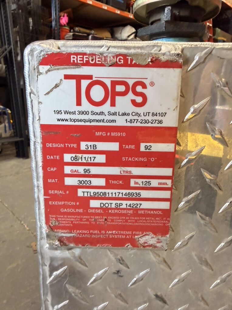 VenmoTops brand truck bed fuel tank with pump hose and nozzle. 95 gallon. Manufactured in 2017. This is the style that can have a toolbox mounted on top of it. No corrosion stainless steel in great shape. No scammers, no codes, call if interested.
