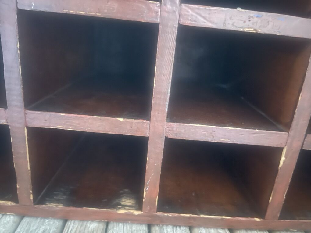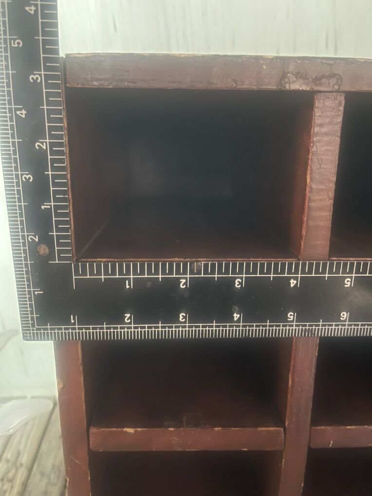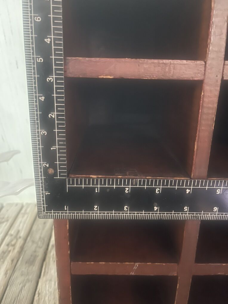 Venmo16 space vintage cubby organizer. Could be used as a wine rack. 18 5/8” wide 14 1/2” tall add 3/4” for top trim piece 9 1/4” deep OBO
