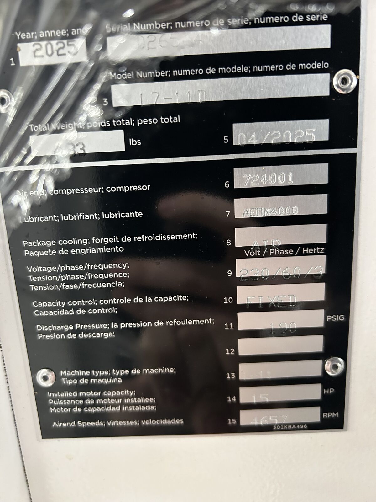15 HP Screw Driven Compressor, Brand new. 0 Hours 230/60/3 190 PSI