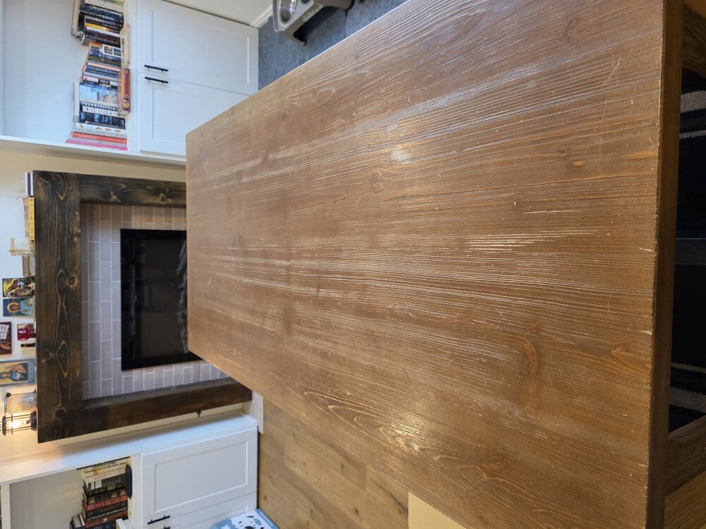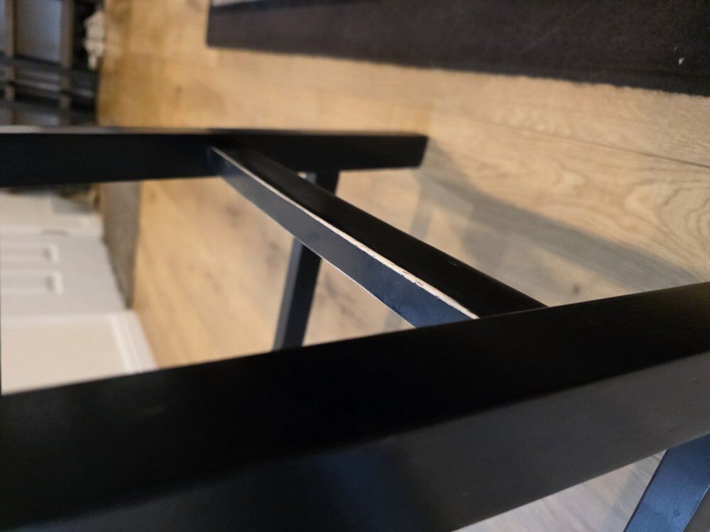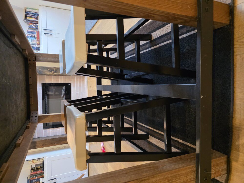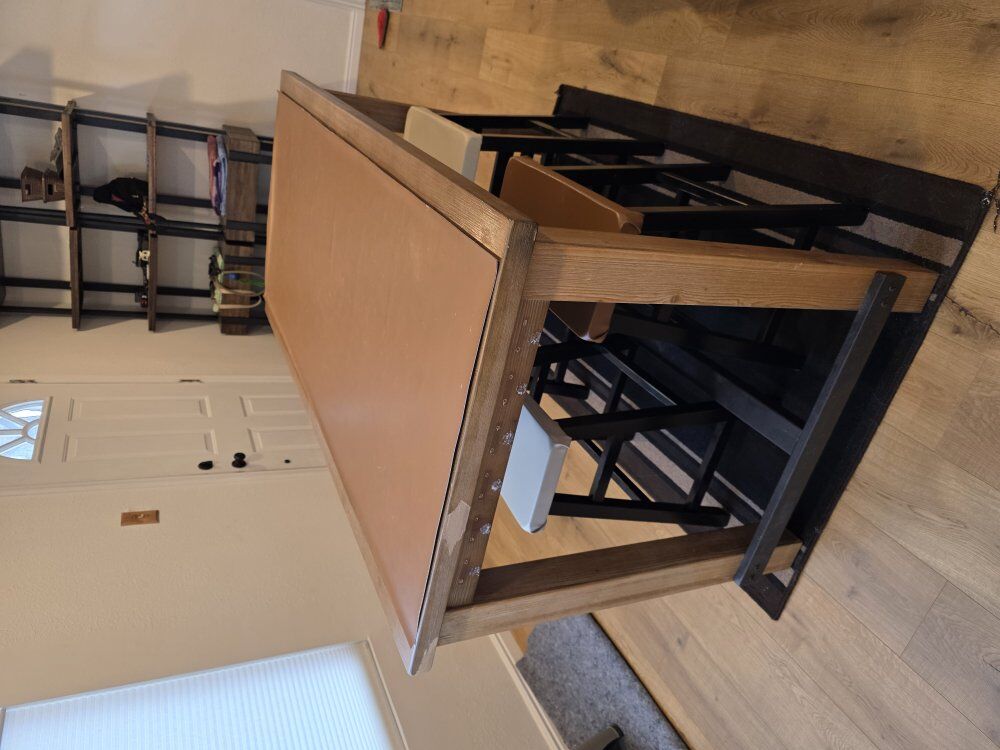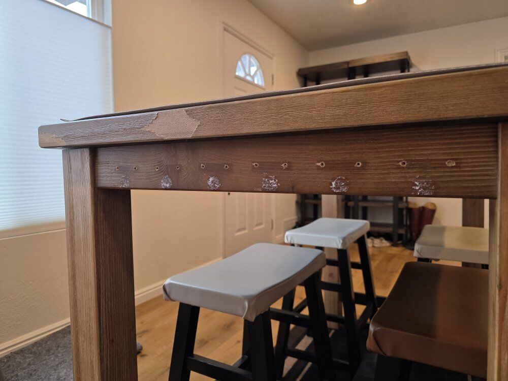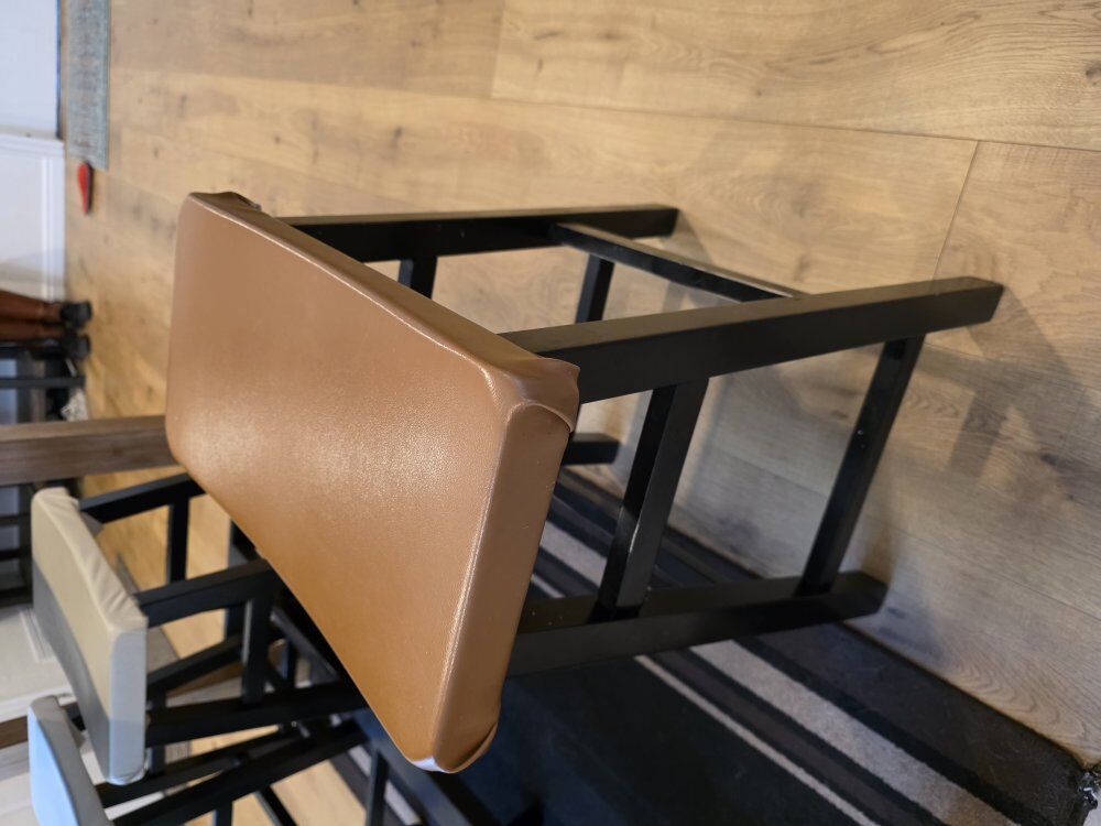 This is a dining table and stools set. It comes with the table, the stools, and the faux leather top. The faux leather on the stools was added by me. The set is in fair condition with wear. It previously had some accessories mounted to the sides (see pictures with holes), and it has a small section where the veneer has come off. The stools have some sections where the black stain / dye has come off. When the stools were new, I believe they were $40 each and the table was originally $269 (per the sticker).