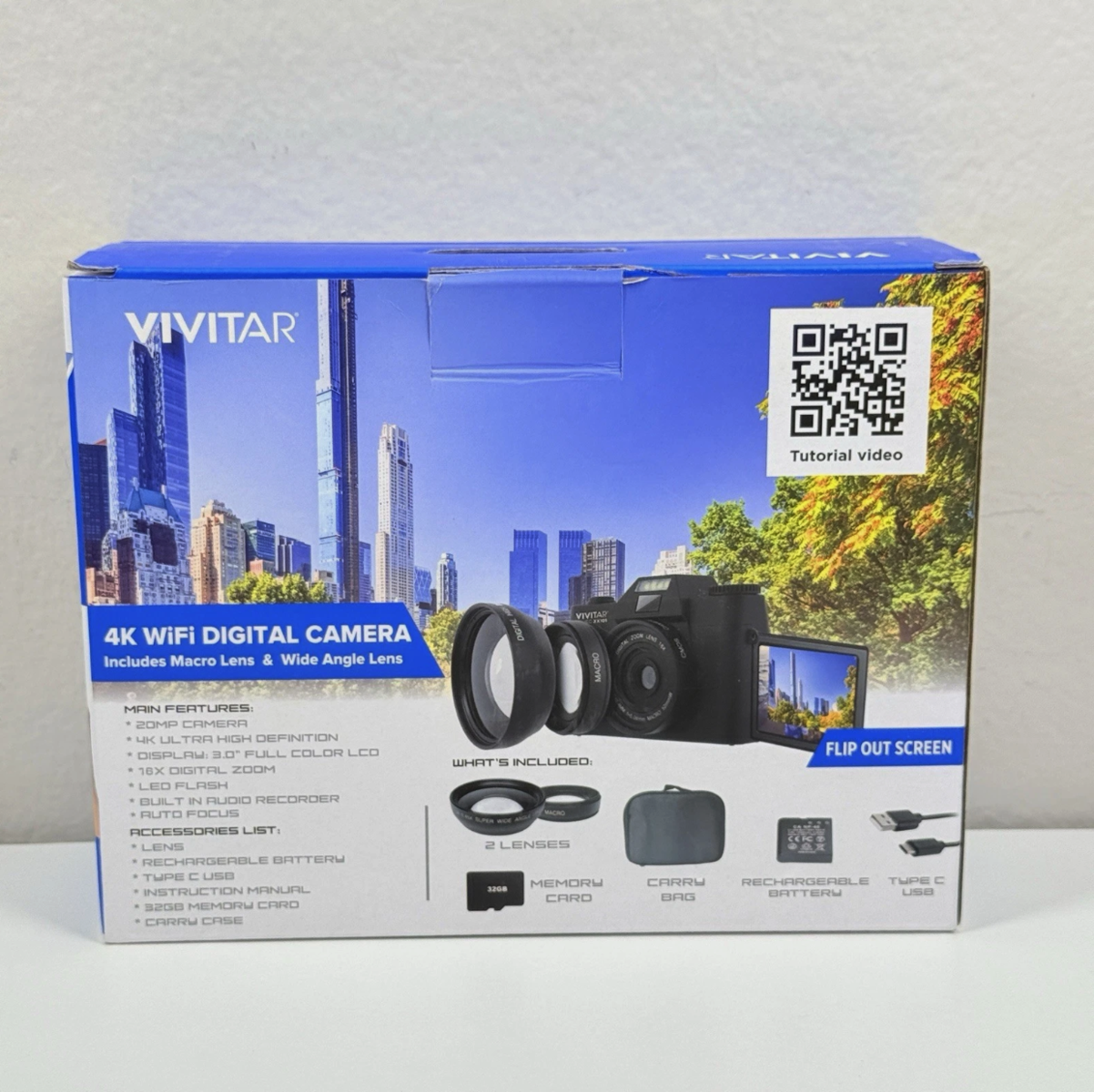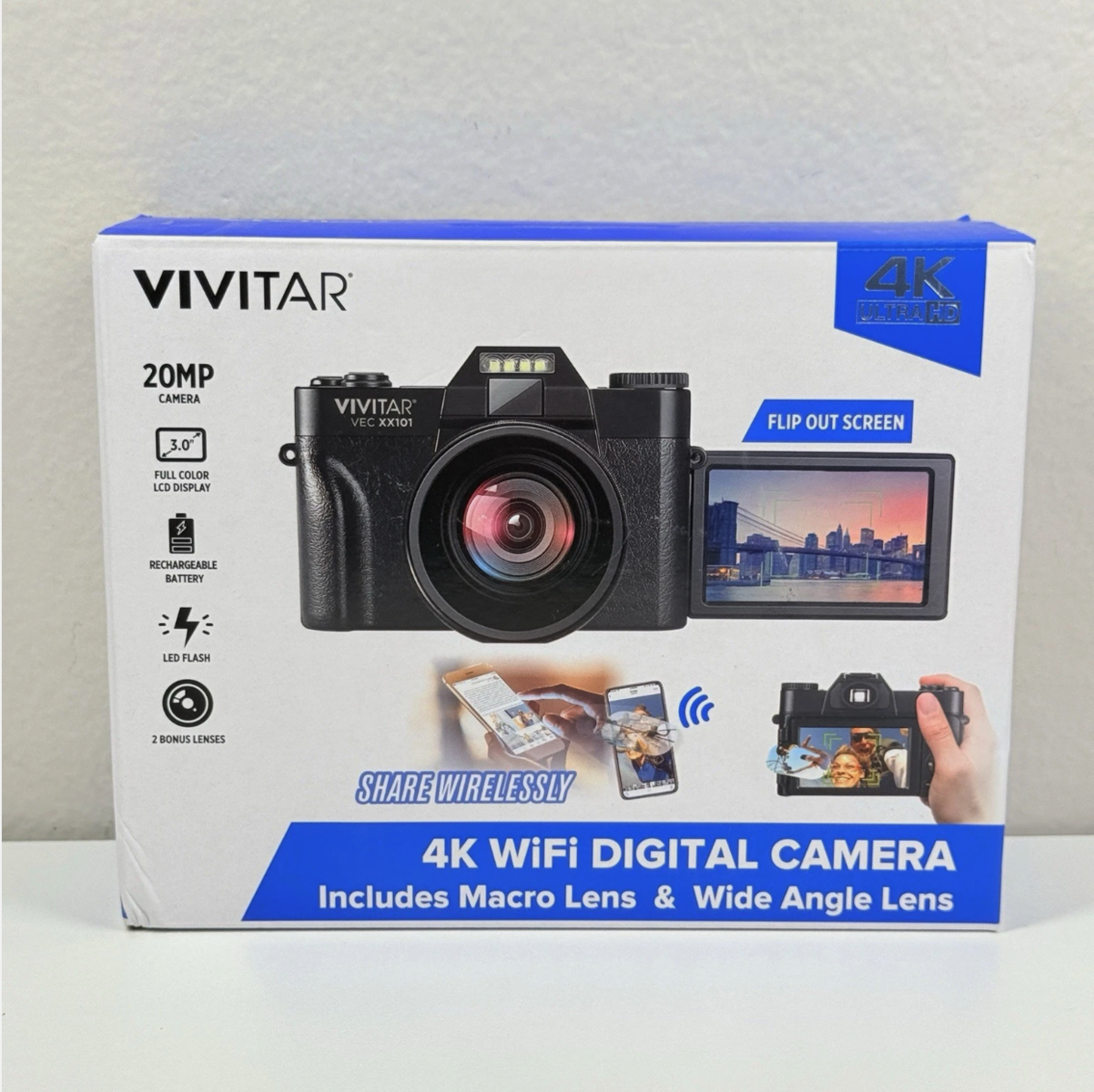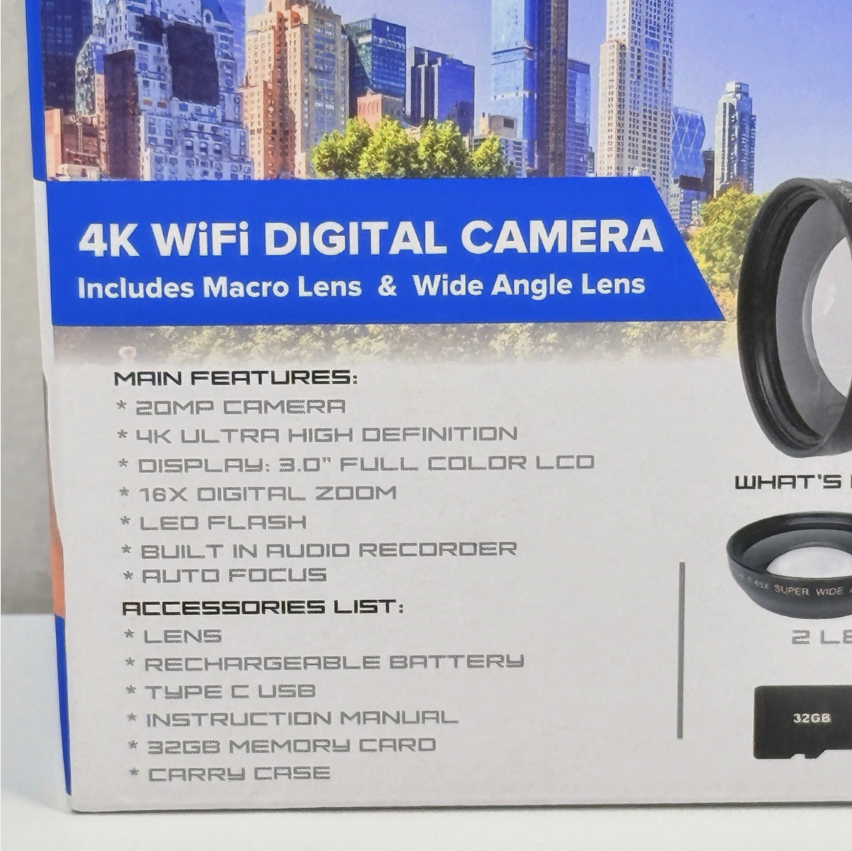 Compact and easy-to-use point-and-shoot camera with a 20MP sensor and crisp 4K Ultra HD video recording. Features a large 3” LCD screen, autofocus, LED flash, and rechargeable battery. Includes bonus macro and wide-angle lenses—perfect for everyday photos, travel, and close-up shots.