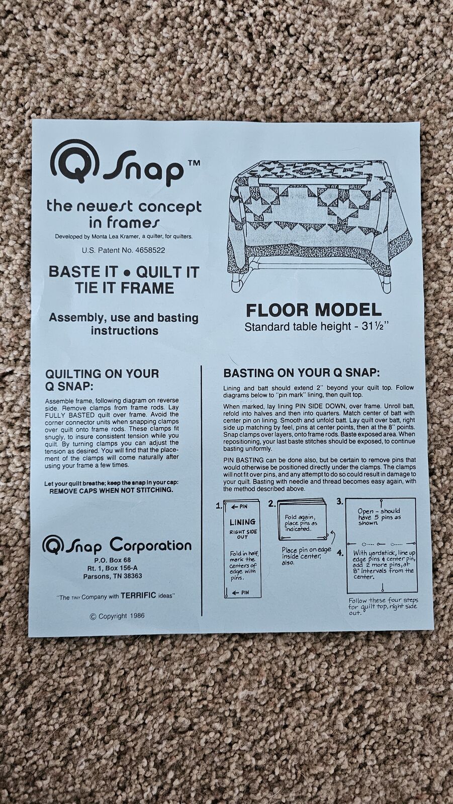 Q Snap quilting frame. Approximately 31.5 in high x 28" X 29". Great condition. Easy to store when not in use.