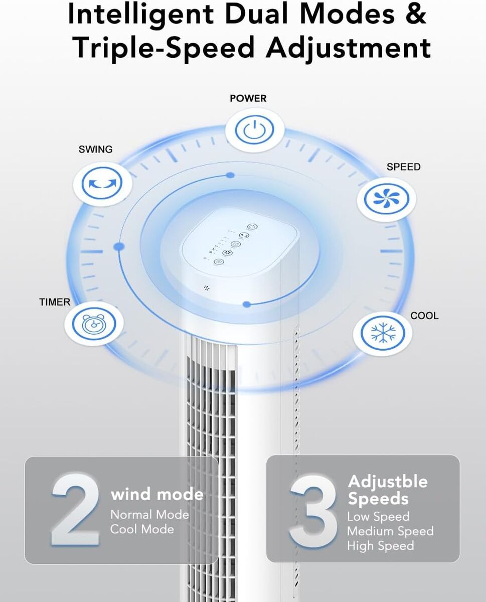 Stay cool with this sleek tower unit that works as an air cooler, fan, and humidifier. Ideal for rooms up to 300 sq ft, it uses evaporative cooling with water and ice packs for extra chill. Features a quiet 35dB operation, 7-hour timer, remote control, and touch panel. Portable, windowless design—perfect for bedrooms, offices, or dorms.