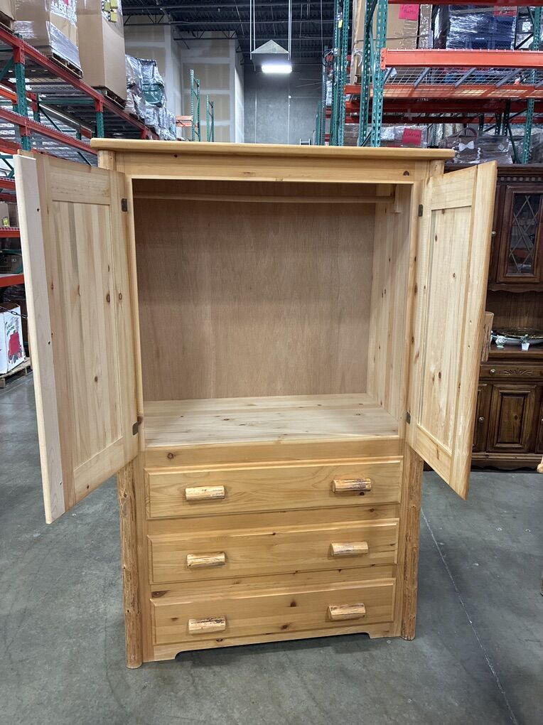 ApplePayThis is a beautiful piece! This log style wood armoire dresser with three large drawers is one of a kind. It’s an amazing condition. We have it for sale at our store here at 95 Foxboro suite 100