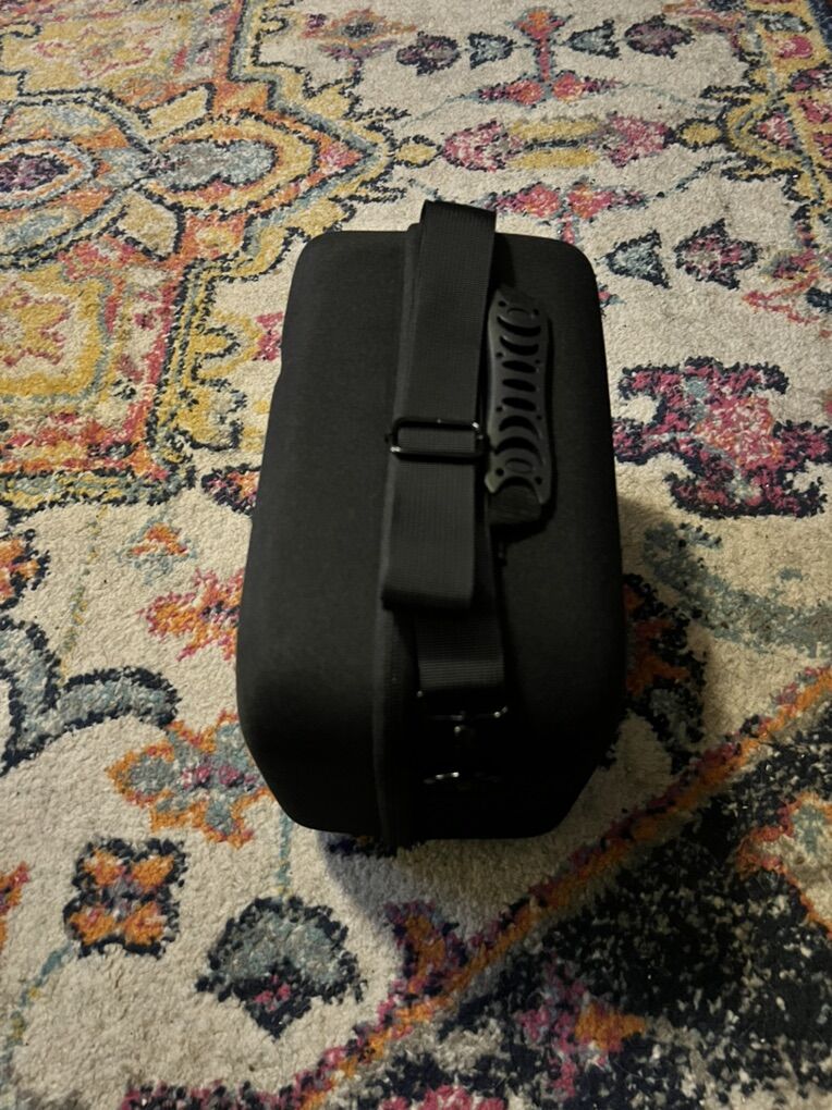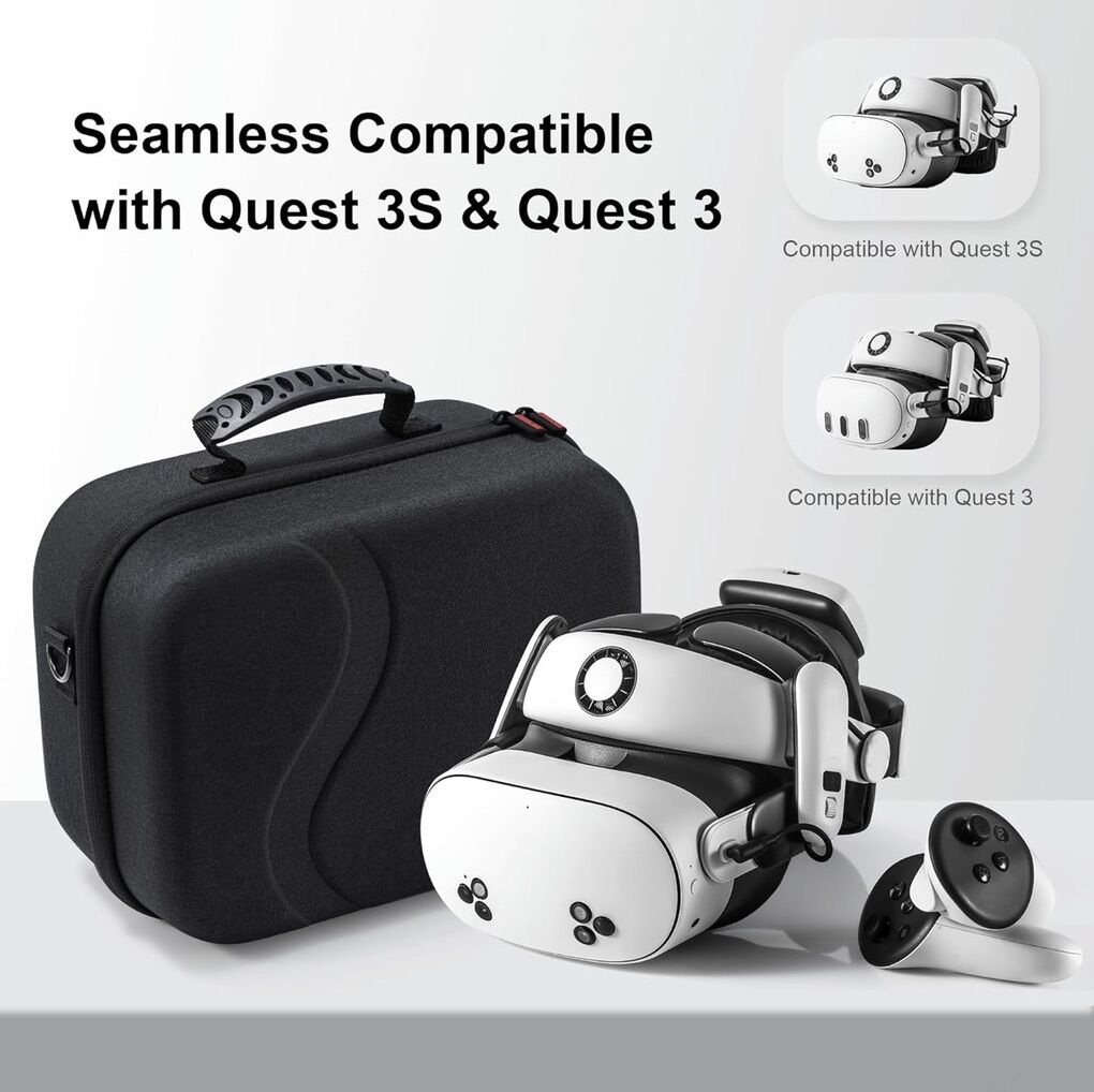Hard-sided VR case suited for the BoboVR S3 pro strap with the Meta Quest with an inside pocket and restrained headset and controllers.