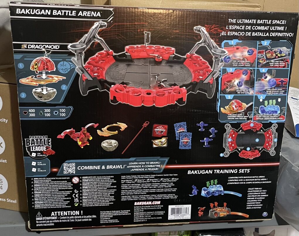 VenmoBakugan Battle Arena playset. It includes an exclusive Special Attack Dragonoid Bakugan figure and trading cards. The arena is customizable with clan flags and sparring totems to create obstacles. It features spinning elements and paddles for unique gameplay. A built-in phone holder allows users to record their battles. New.