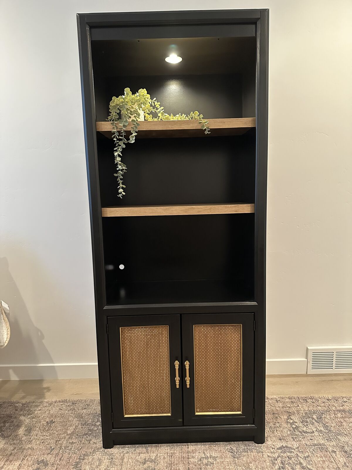 VenmoBeautiful black hutch with adjustable wooden wrapped glass shelves. Real wood.