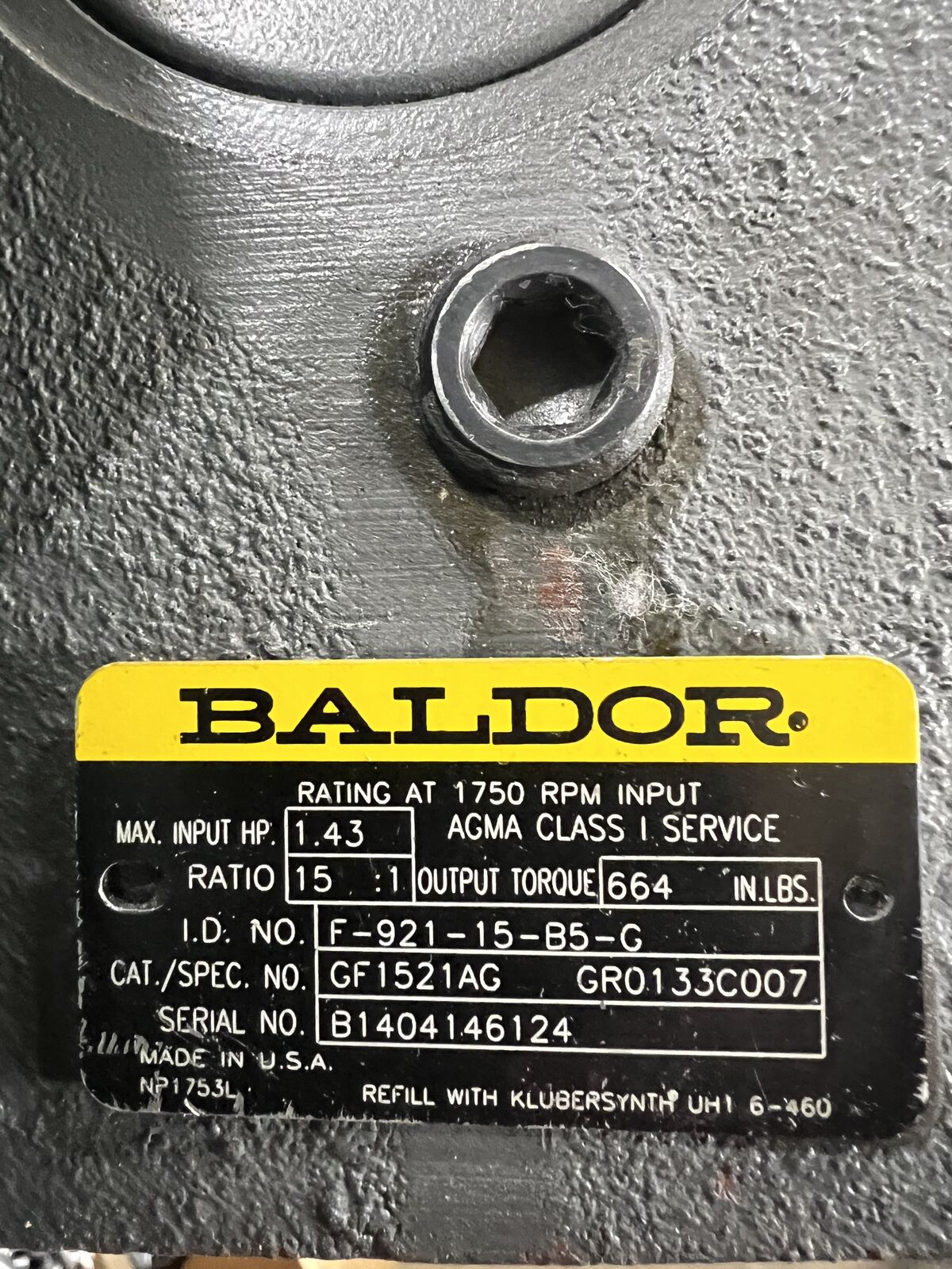 Includes a Baldor worm gear speed reducer, model GF1521AG. Key specifications include:
