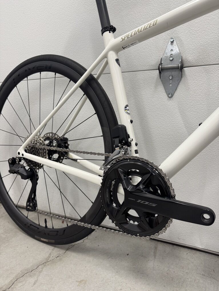 Wheels: Specialized Alpinist CLX II (MSRP $2500, high-end climbing/lightweight wheelset, comes stock on S-Works) Tires: Specialized Turbo TLR 28c Drivetrain: 12-speed Shimano 105 Di2 Bars: carbon Roval Rapide 38cm Saddle: Specialized 143mm Power Comp
