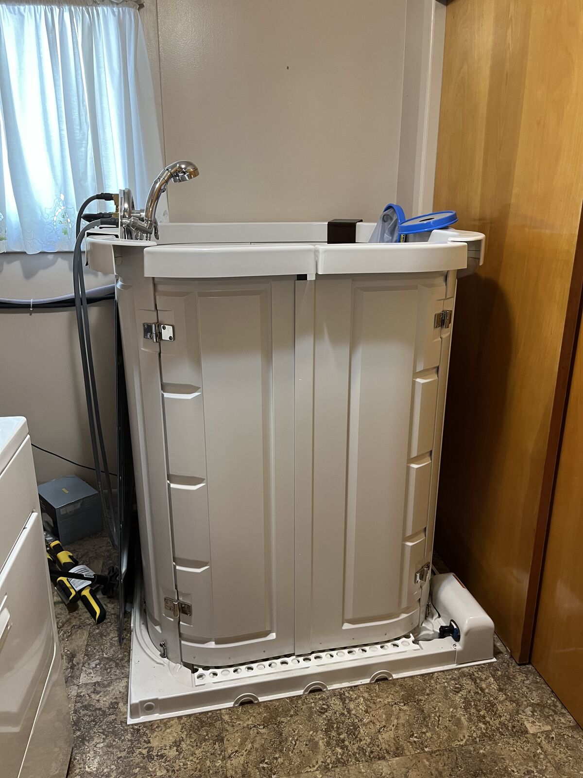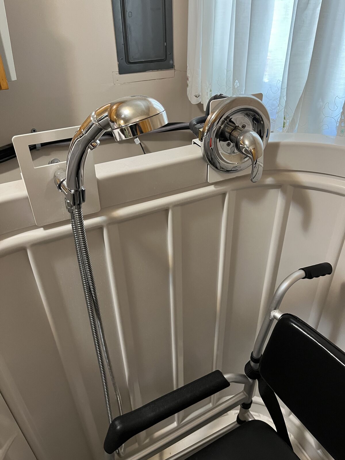 Shower has long hot and cold water hoses that attach to water taps (like washing machine taps), drain hose that attaches to plumbing drain. A detachable ramp for wheelchair use. Shower was used 4 times.