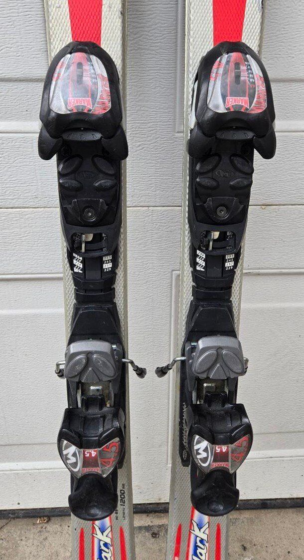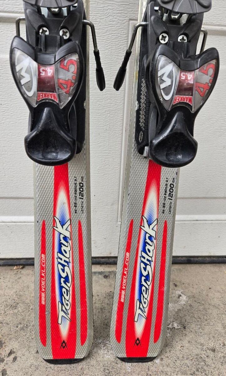 Kids Volkl Tiger Shark 120 cm downhill Snow skis. Marker 4.5 adjustable to your boot size bindings. Top sheets, bases, and edges are in great condition. Text is best.