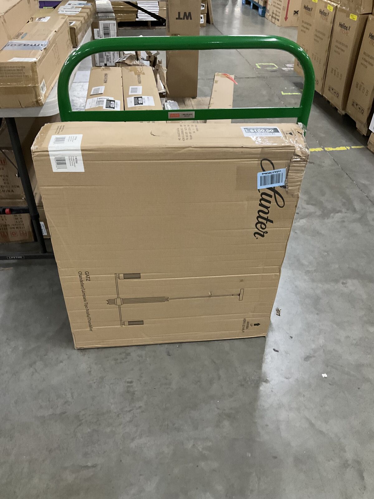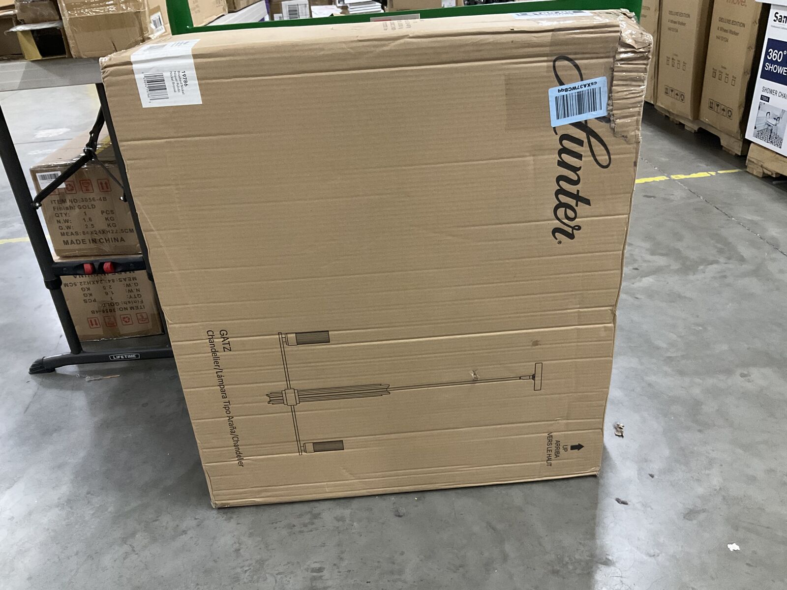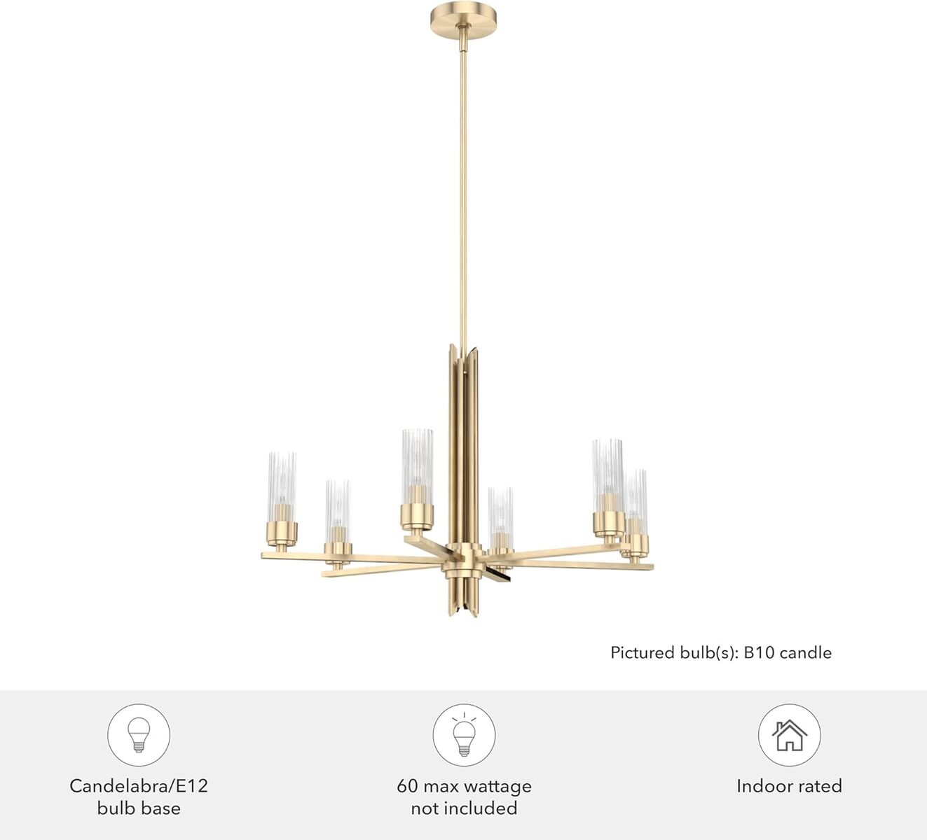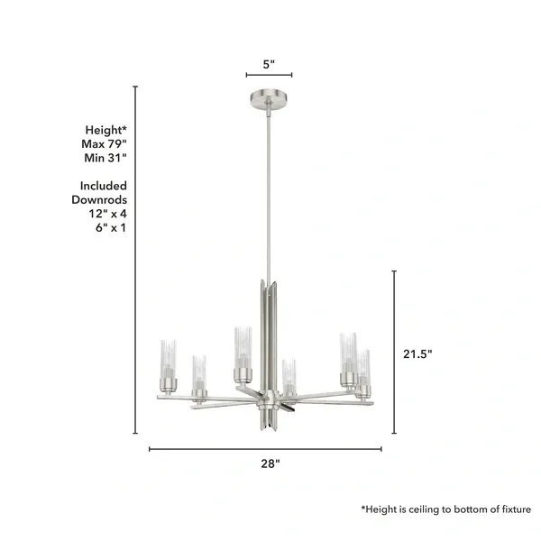 The Hunter - Gatz 6-light Large Chandelier features a Brushed Nickel finish and a modern style with candle-shaped lights. This dimmable fixture is suitable for various rooms, including bedrooms, kitchens, dining rooms, and living rooms.