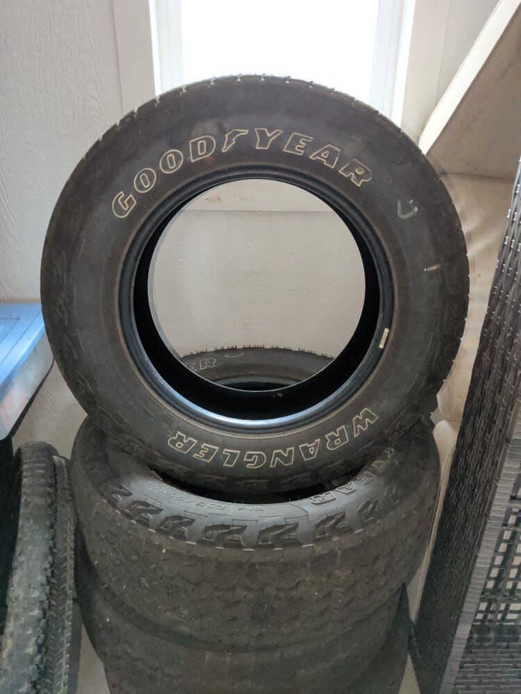 Good year wrangler tires. Territory ATS m-s rated. These were taken off a brand new Ranger after we put on 2,000 miles or less. 255/65/18 white wall lettering on one side.