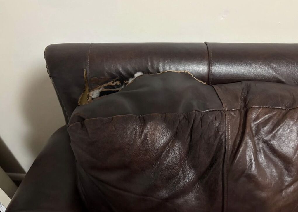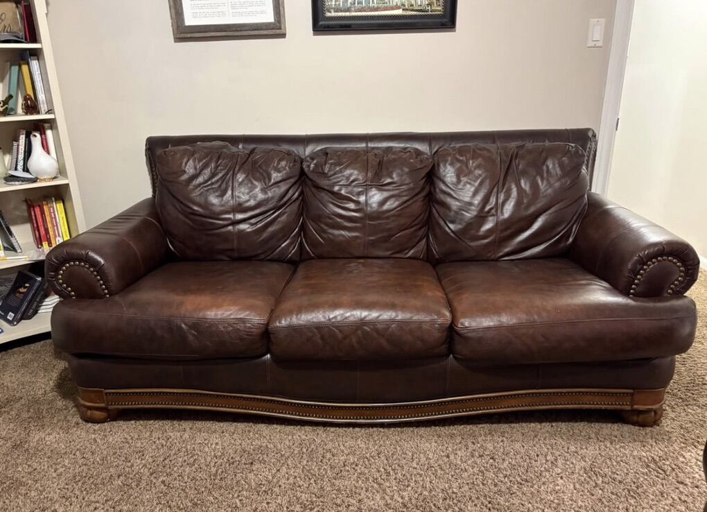 We are moving and no longer have room for these comfy leather couches. One does have a hole in the top that could be stitched up!