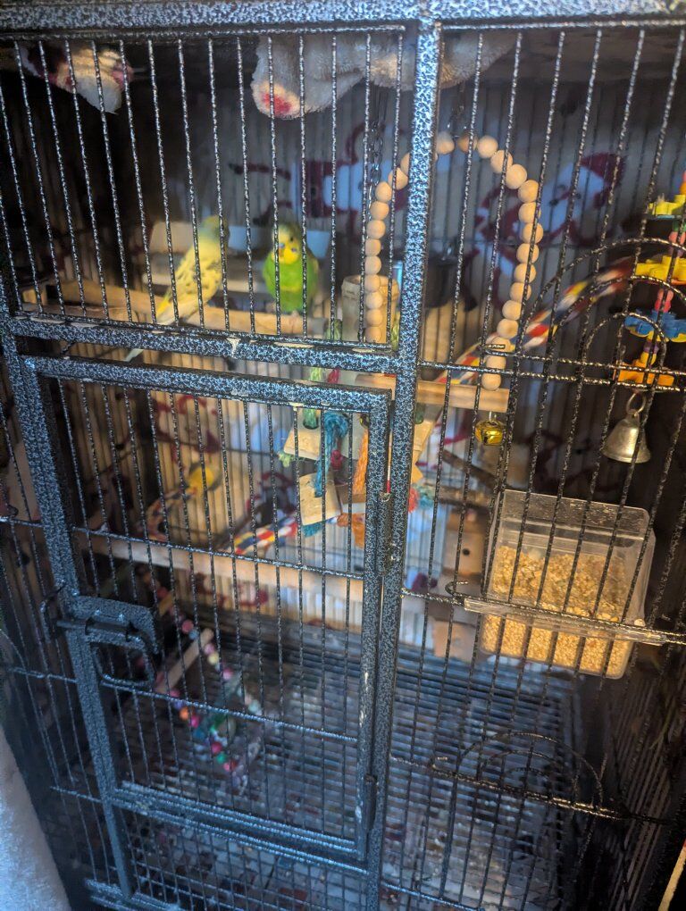 I have three bachelor parakeets along with their cage for sale. One of them is missing a leg but doesn't seem to bother him none. (not hand tamed) I'm selling them together. I will not separate their bonded all three. I'm only rehoming them because my son developed an allergy.