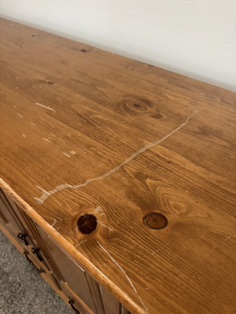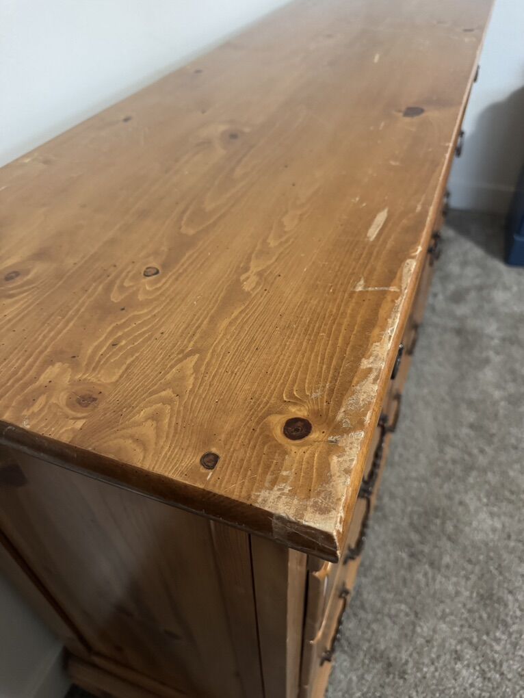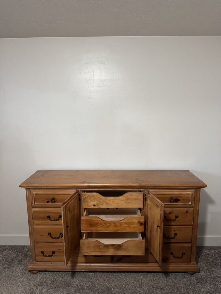 ApplePay68” long, 37.5” tall and 18”deep. It has a large scratch from moving and some usage wear on the top, detailed in the photos. All eleven of the drawers work well. It just doesn’t fit in my space. It is rather heavy and will need to be moved down 5 stairs, so bring help to load it.