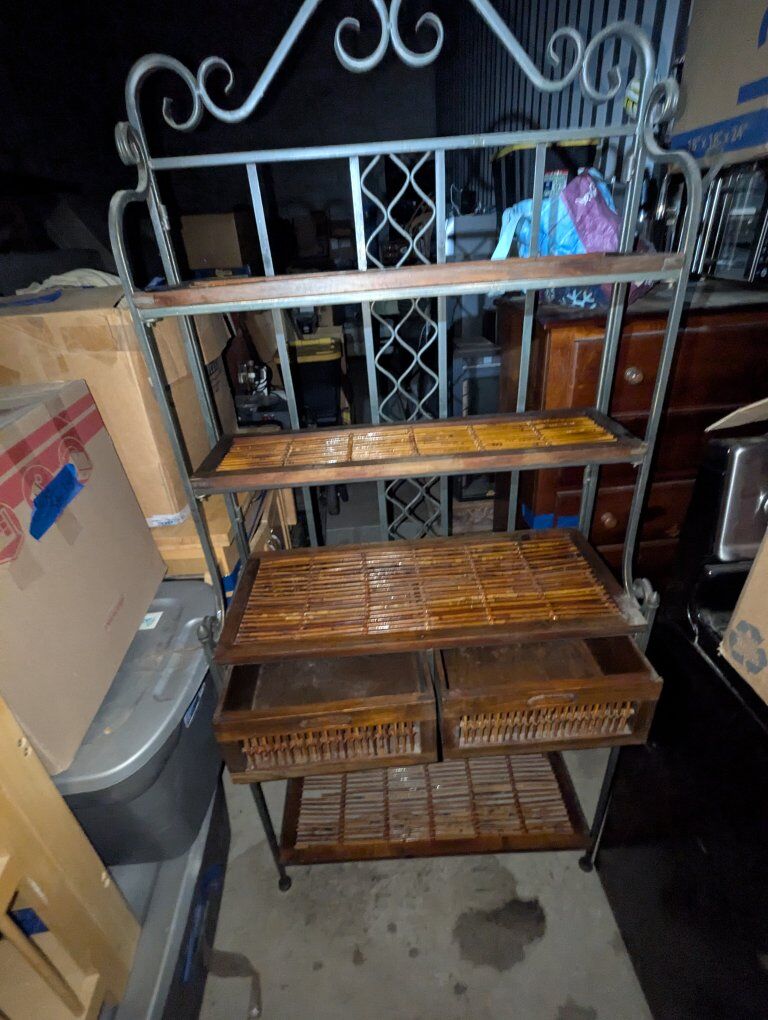VenmoVintage Rod Iron Bakers Rack With Wicker Drawers and Shelves