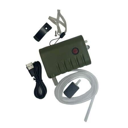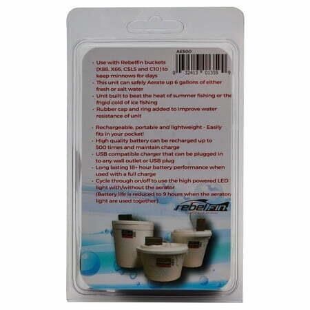 Rechargeable - can last up to 18 hours on one charge Aerates up to 6 gallons of water for longer minnow life Portable & Lightweight - fits in your pocket High quality battery can be recharged up to 500 times USB charger for easy recharge anywhere/any time Standard Electrical Plug allows charging in standard wall outlet Press on/off switch to use the high powered LED light.